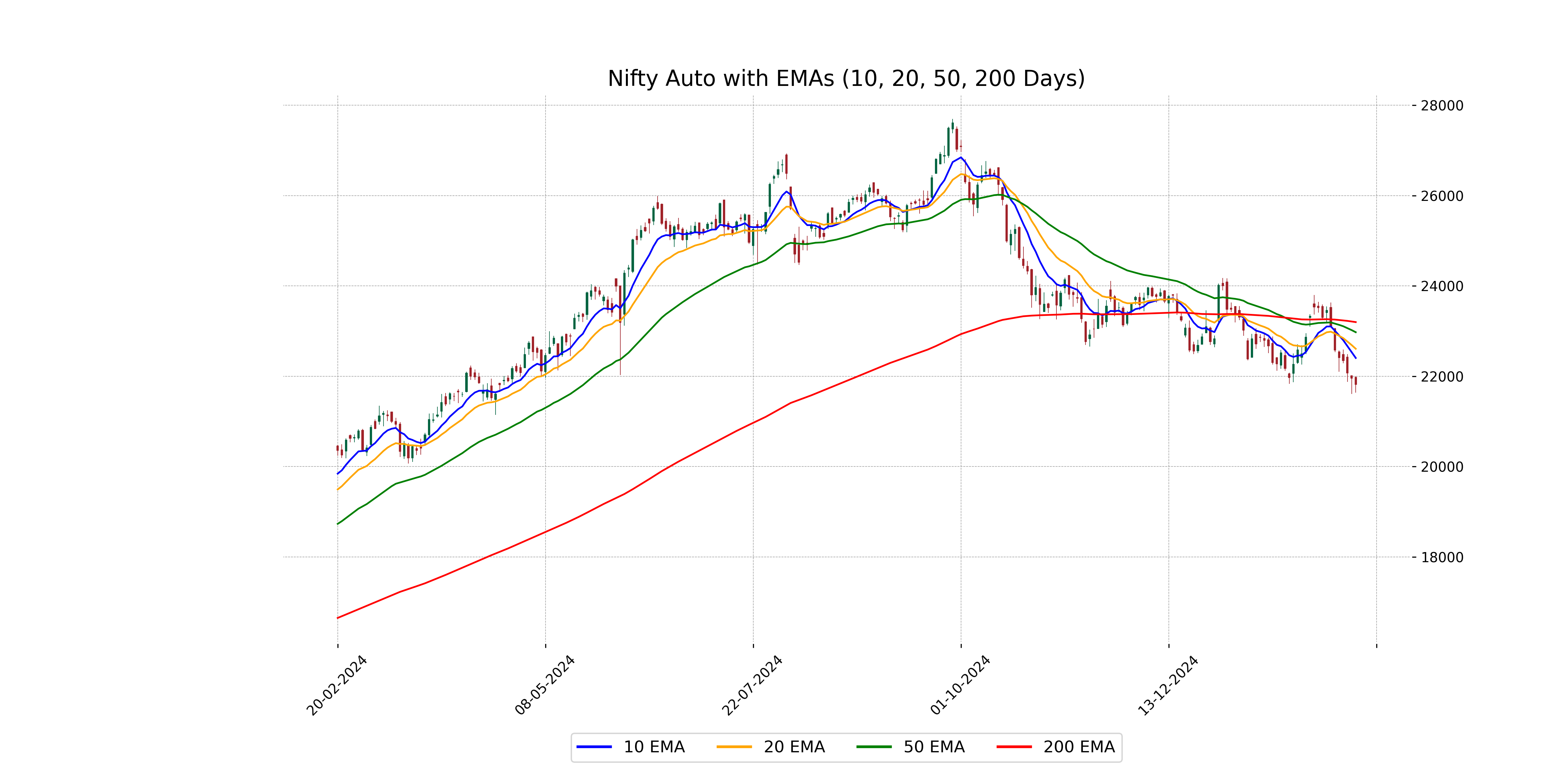 The Nifty Auto index closed at 21,818.90, which is below its 10-day EMA of 22,405.09, 20-day EMA of 22,608.62, 50-day EMA of 22,975.27, and 200-day EMA of 23,199.27, indicating a bearish trend relative to these moving averages. The index's current position suggests it is experiencing downward momentum.