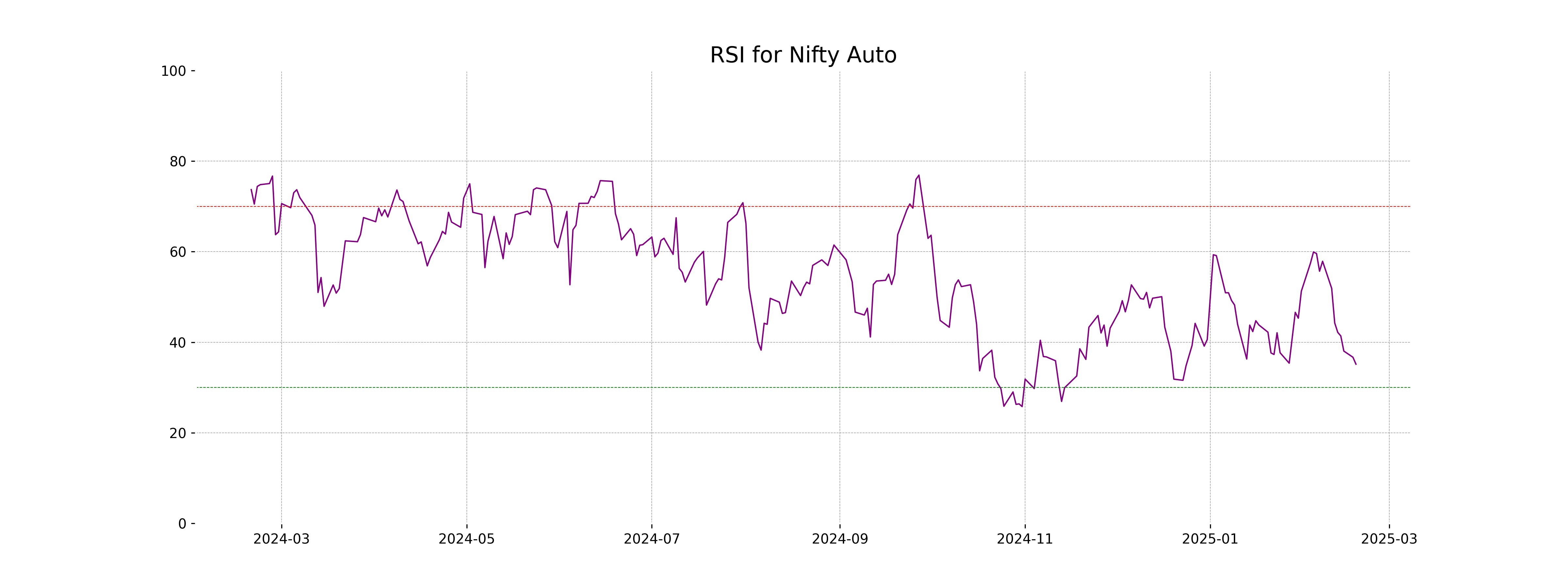 The Nifty Auto index has an RSI of 35.15, indicating that it is approaching the oversold territory. This suggests that the selling pressure might be high and there could be a potential buying opportunity if the trend reverses. An RSI below 30 typically signals that the asset is oversold.