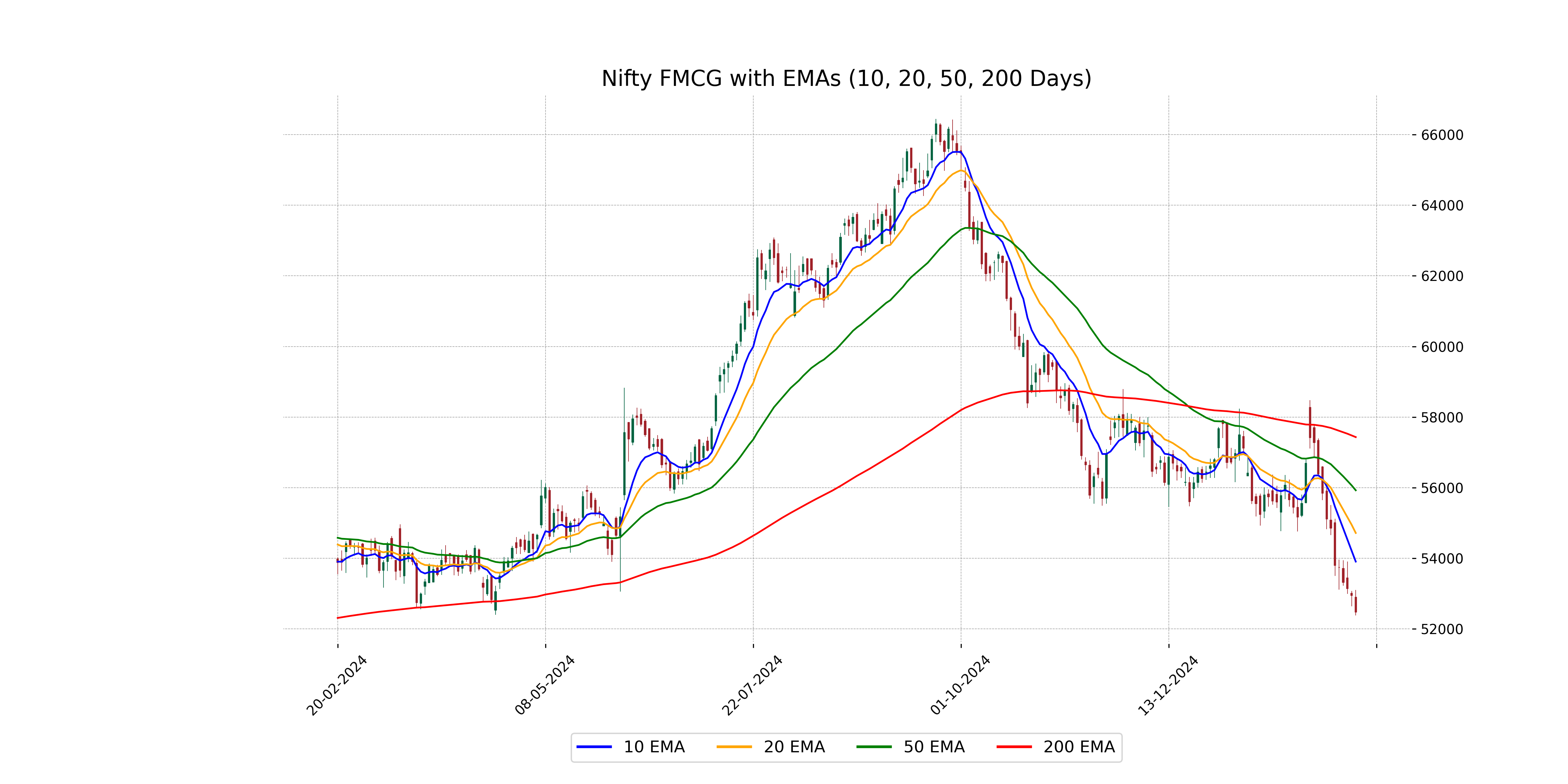 The Nifty FMCG index opened at 52,897.55 and closed at 52,480.5, marking a decrease of 0.88% or 464.5 points from its previous close of 52,945. The technical indicators suggest a bearish trend, with the index trading below its 10, 20, 50, and 200-day EMAs and a low RSI of 26.35. Additionally, the MACD is negative, indicating further downside potential.