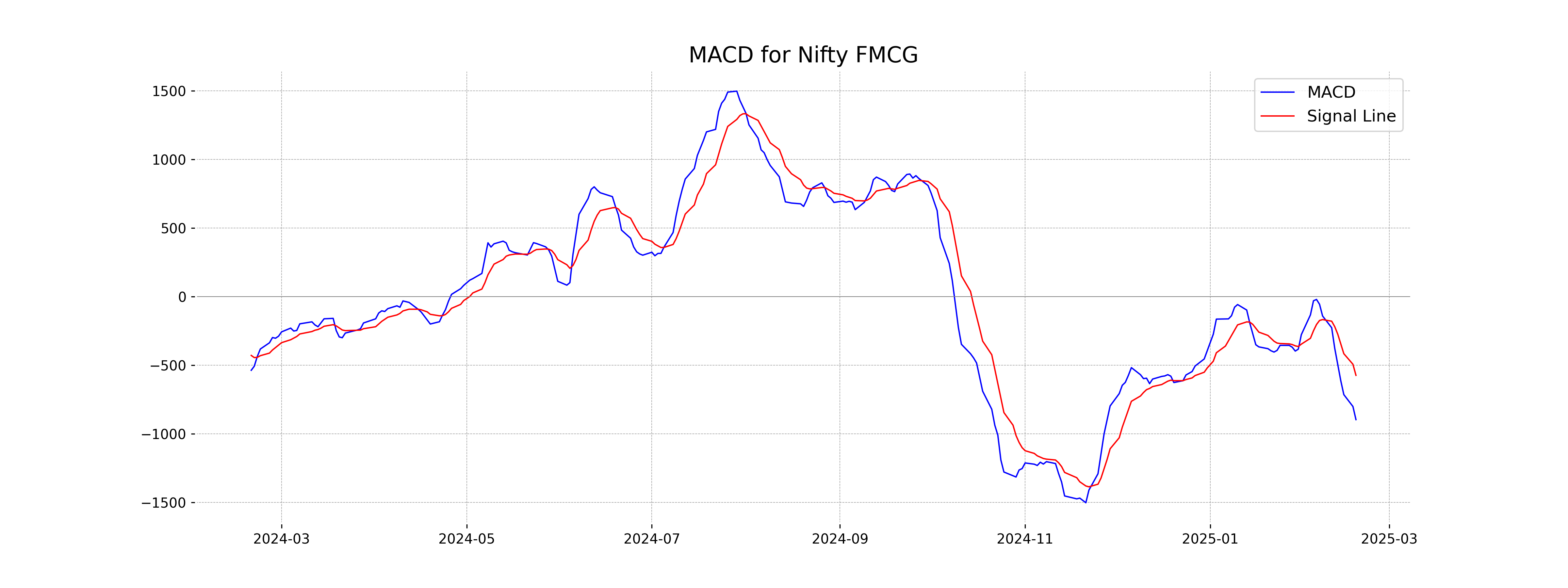 The MACD analysis for Nifty FMCG indicates bearish momentum, as shown by the negative MACD value of -895.87, which is below the MACD Signal line at -573.21. This suggests that the stock may continue to decline unless there's a positive reversal in trends.