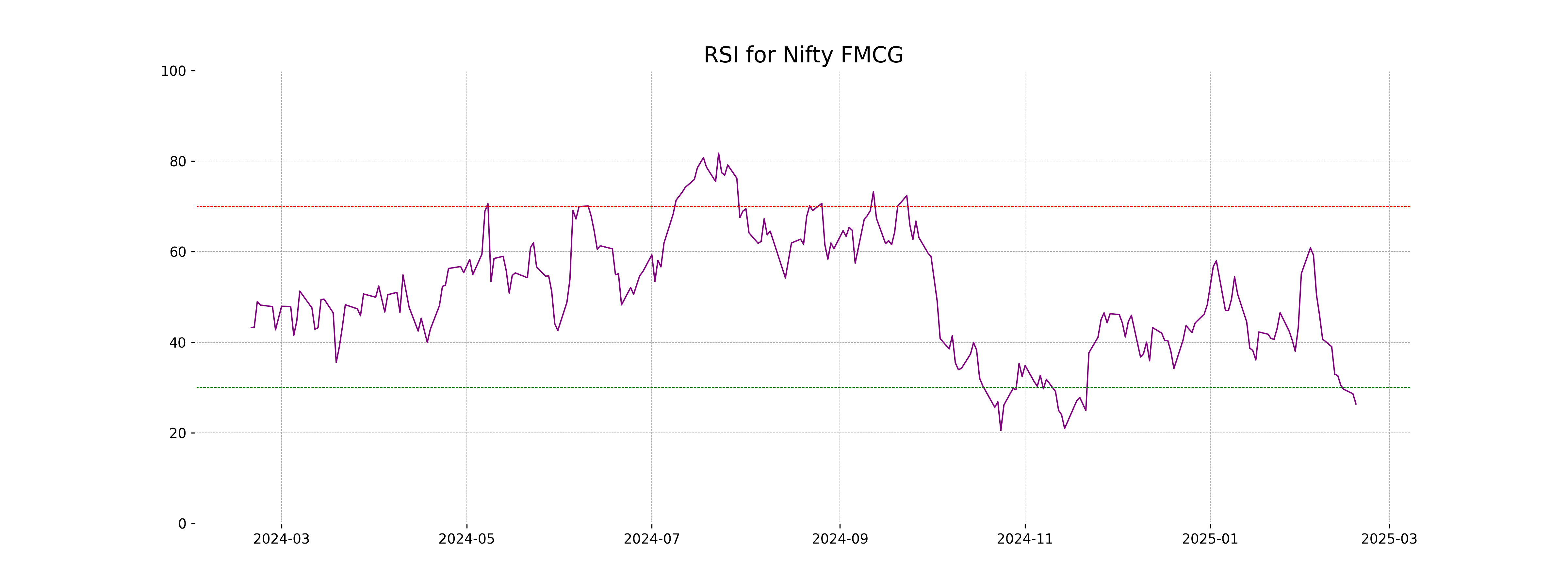 The Nifty FMCG index has an RSI of 26.35, which indicates it is in an oversold condition. This typically suggests that the index may be undervalued or that a potential rebound could occur in the near future.