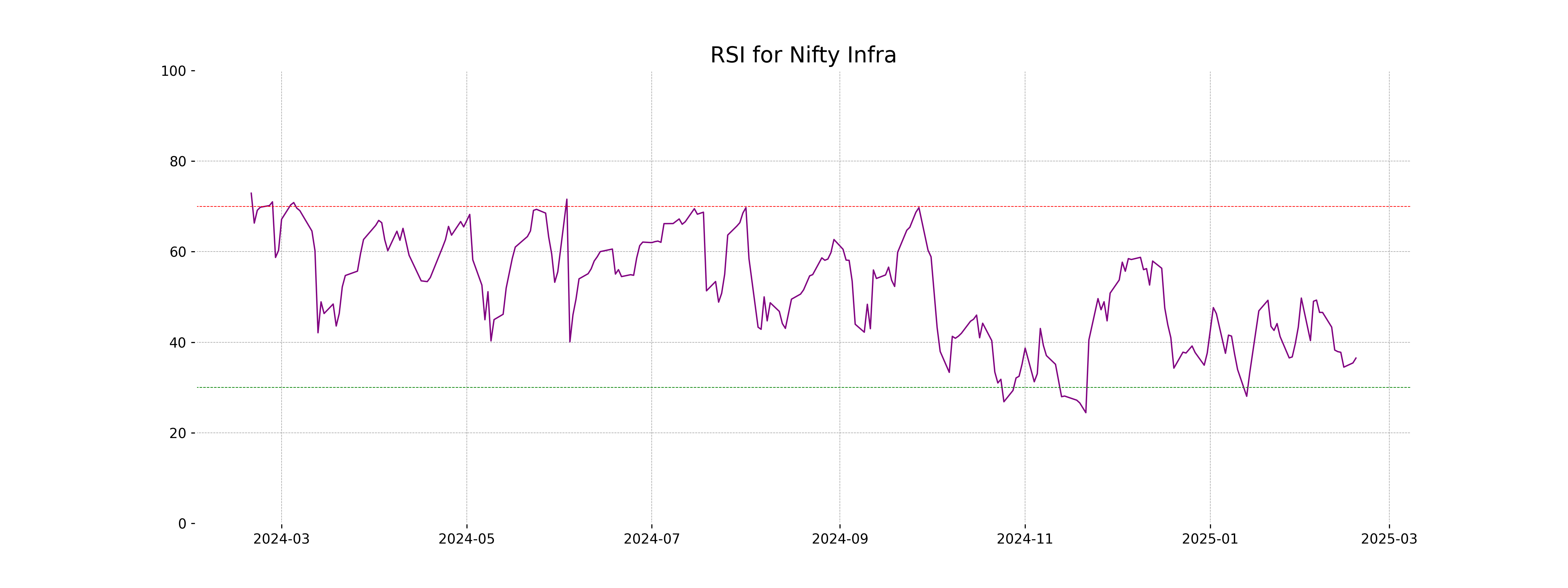 Nifty Infra RSI Analysis: The Relative Strength Index (RSI) for Nifty Infra is at 36.50, indicating it is nearing oversold territory. Typically, an RSI below 30 suggests an asset may be undervalued or weakening, while levels closer to 70 indicate overbought conditions. Current RSI suggests limited selling pressure but not yet deeply oversold.
