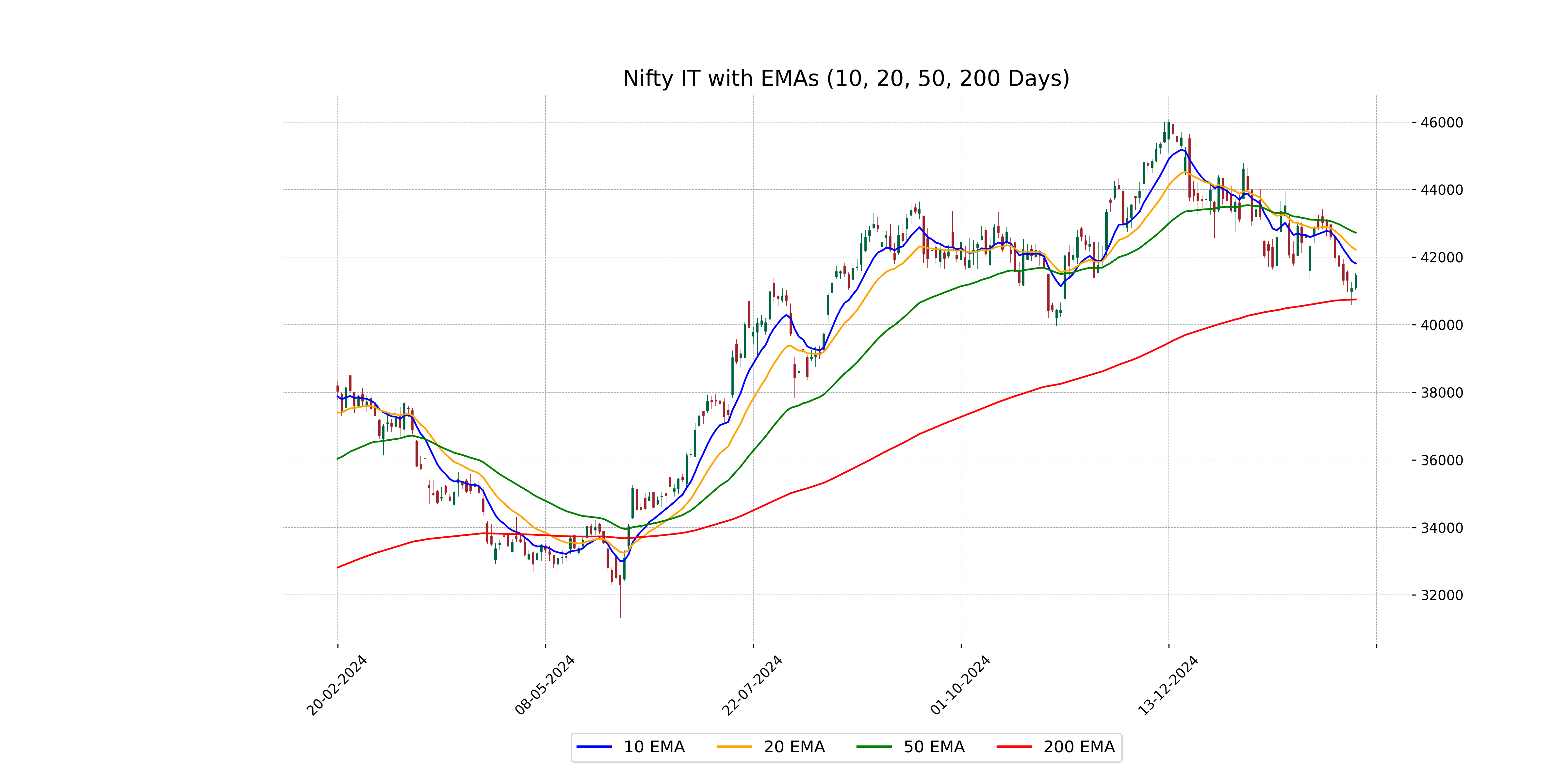 The Nifty IT index closed at 41464.35, which is below its 10 EMA of 41812.51, 20 EMA of 42221.09, and 50 EMA of 42723.86, indicating it is currently trading below these key short to mid-term averages. This positioning suggests a potential bearish sentiment in the short-term and mid-term outlook.