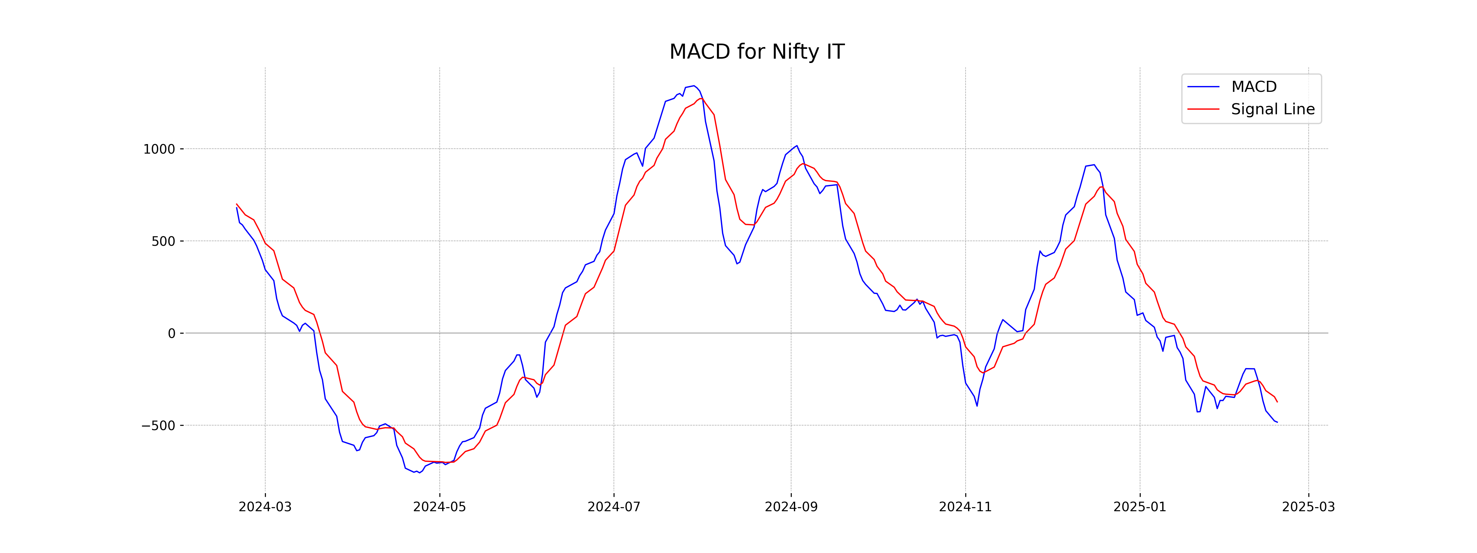 The MACD for Nifty IT is negative at -483.75, while the MACD Signal is -373.28, indicating a bearish sentiment with the MACD line below the signal line. This suggests downward momentum, but traders should look for potential reversals if the MACD begins to converge towards the signal line.