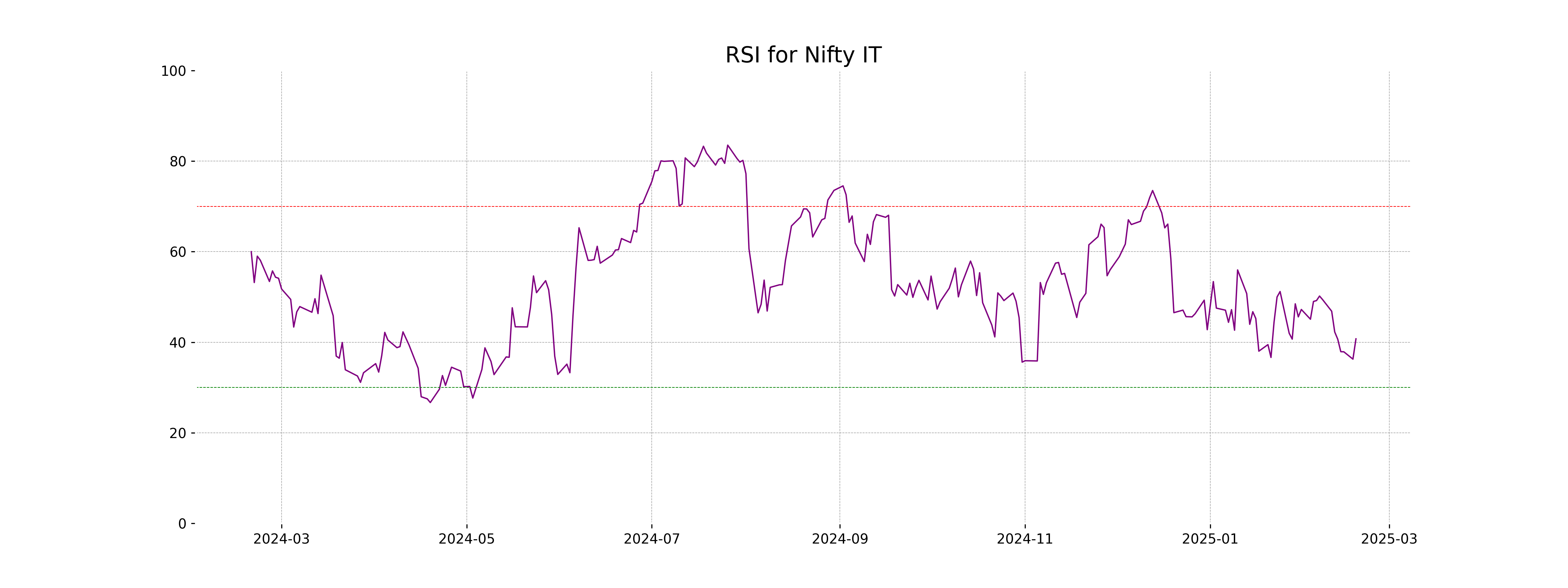 RSI Analysis for Nifty IT: The RSI value of 40.75 suggests that Nifty IT is approaching an oversold region, indicating a potential buying opportunity. However, given that it is below 50, the index currently shows weak momentum.