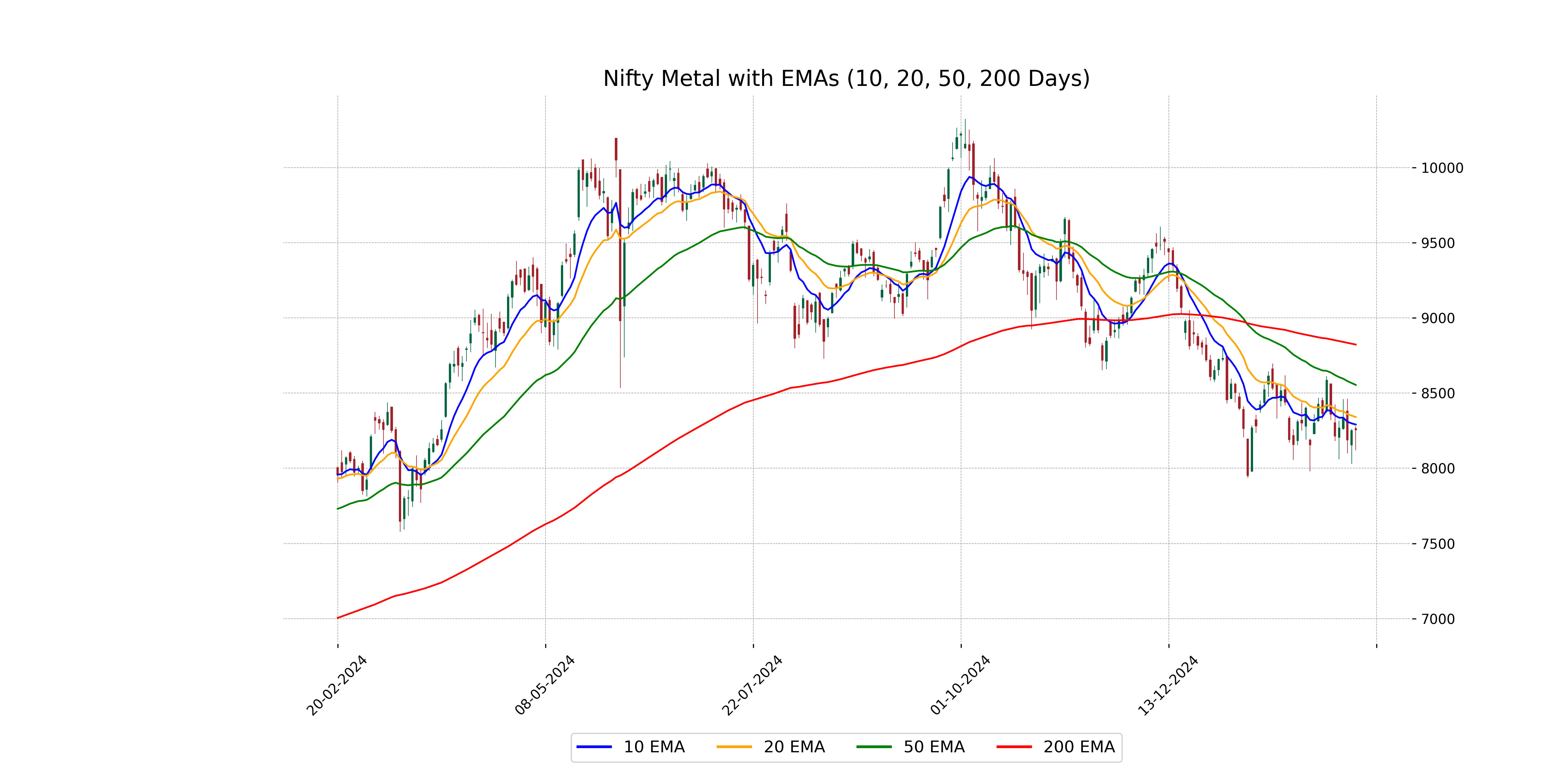 Nifty Metal closed at 8255.60, which is below its 50-day EMA of 8554.20 and 200-day EMA of 8822.44, indicating a bearish trend. However, it is slightly above its 10-day EMA of 8290.61 and below its 20-day EMA of 8340.58.
