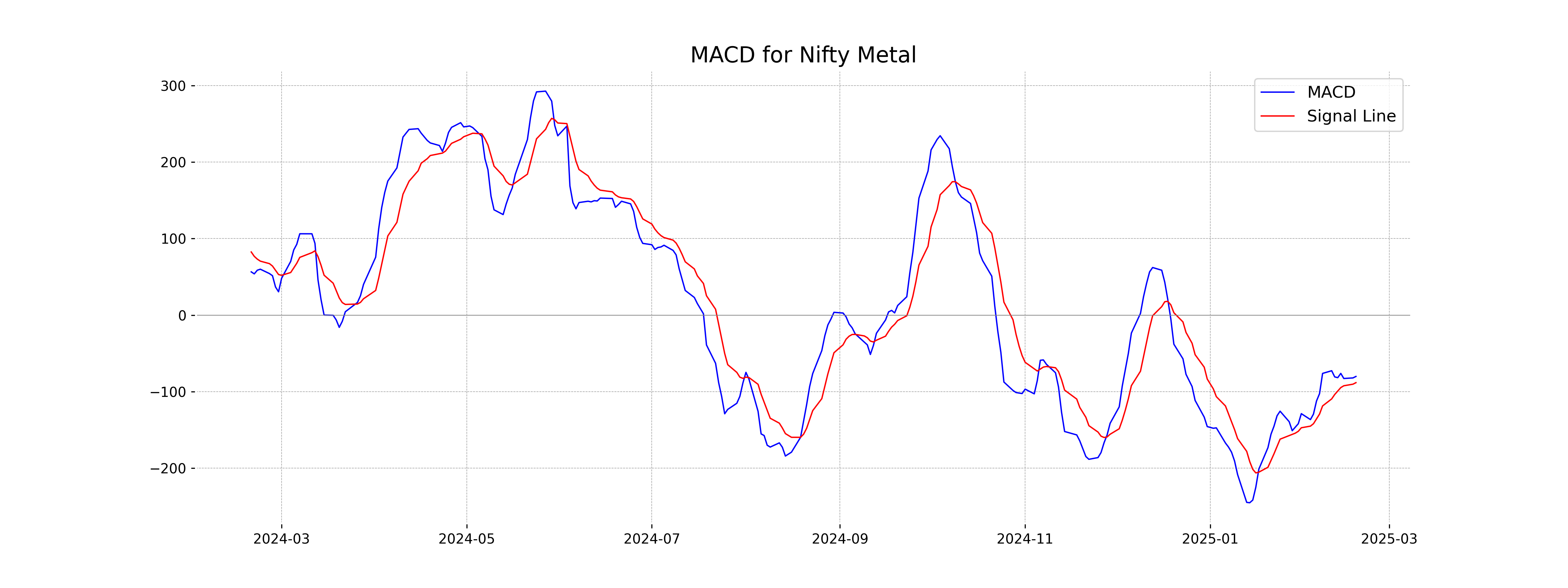 The MACD for Nifty Metal is -80.182 while the MACD Signal is -88.293, indicating that the MACD line is above the signal line. This can typically suggest a potentially bullish crossover, but given that both values are negative, it might also reflect a bearish momentum that is weakening. Traders often look for confirmation from other indicators, such as RSI, which is currently at 45.40, suggesting a neutral to slightly bearish environment.