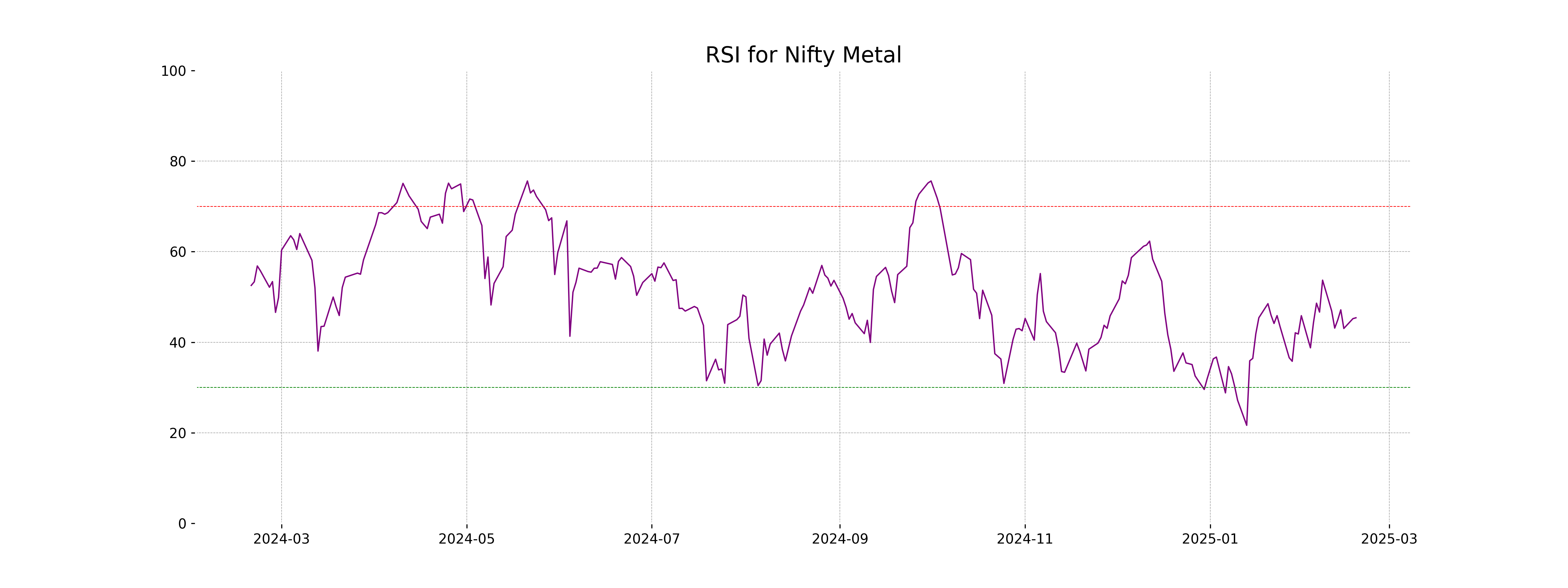 The RSI for Nifty Metal is currently at 45.40, indicating a neutral stance as it is near the midpoint of the typical RSI range between 30 and 70. This suggests that the index is neither overbought nor oversold, potentially implying stability with no imminent risk of a reversal or significant price change based solely on RSI.