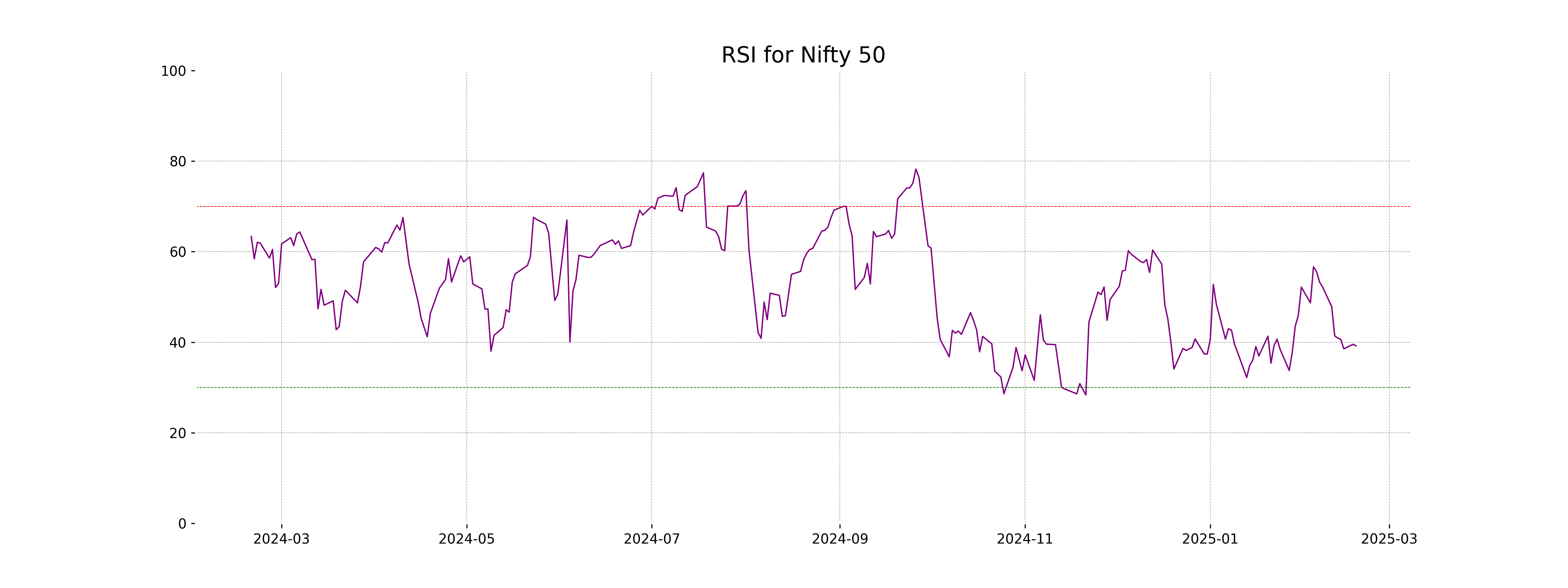 The Nifty 50 has an RSI of 39.21, indicating that the index is approaching oversold territory. An RSI below 30 typically signals oversold conditions, suggesting potential buying opportunities, however, caution is advised as other indicators should be considered.