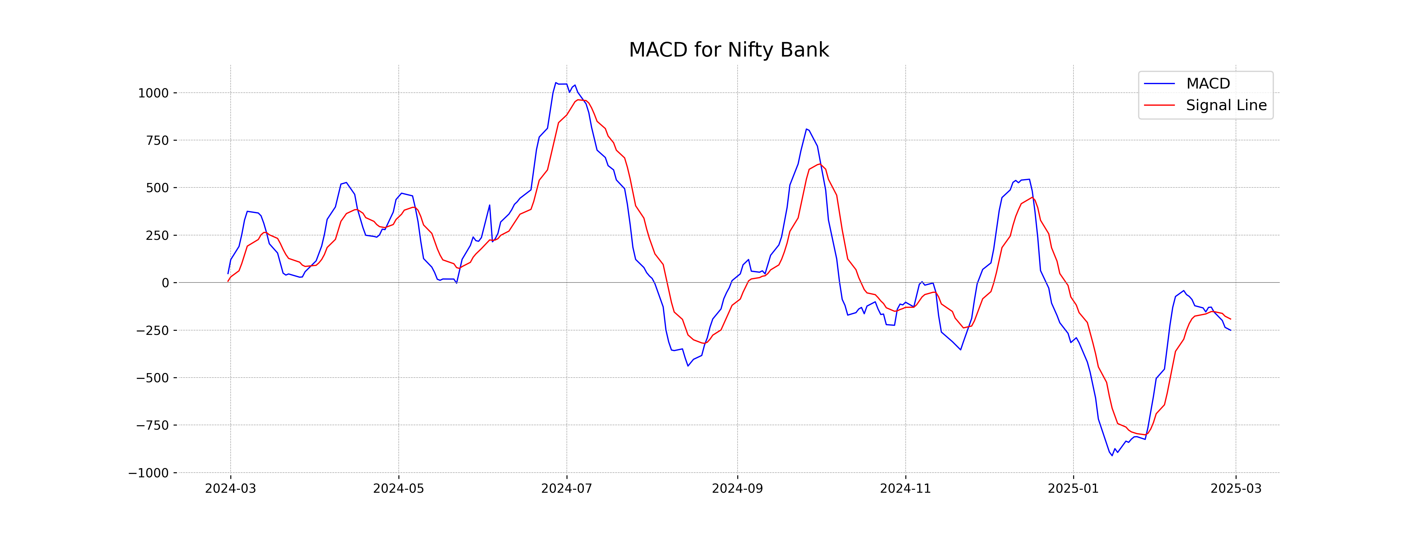 The MACD for Nifty Bank is -250.75, which is below its signal line (-191.86), indicating a bearish trend in the short term. With the RSI at 41.99, it suggests that there is potential for a price reversal, but current momentum remains weak.