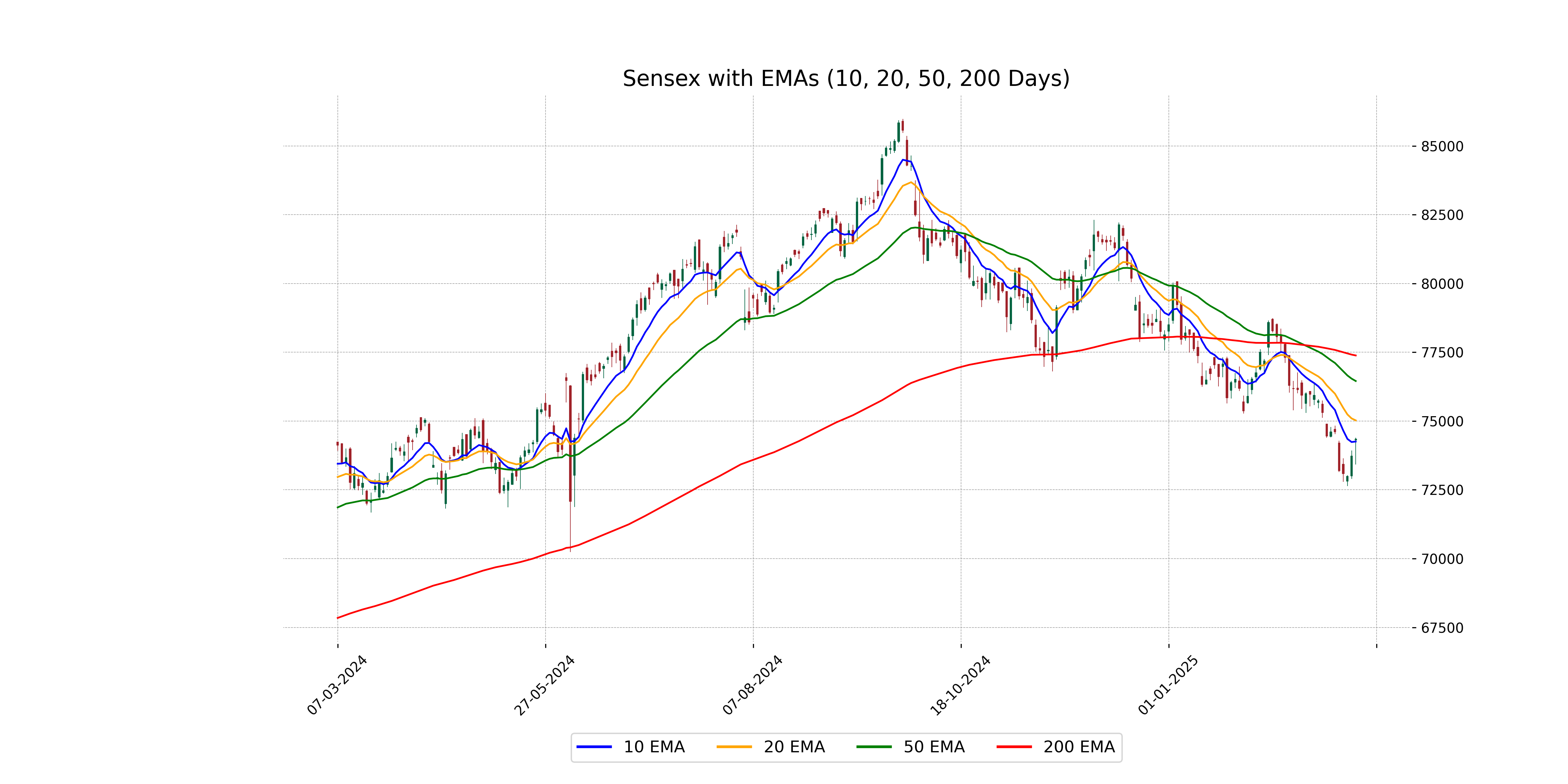 The Sensex closed at 74,340.09, which is below its 50 EMA of 76,454.95 and 200 EMA of 77,384.32, indicating a bearish trend in the short to medium term. However, it is trading slightly above its 10 EMA of 74,255.80, suggesting a potential short-term support.