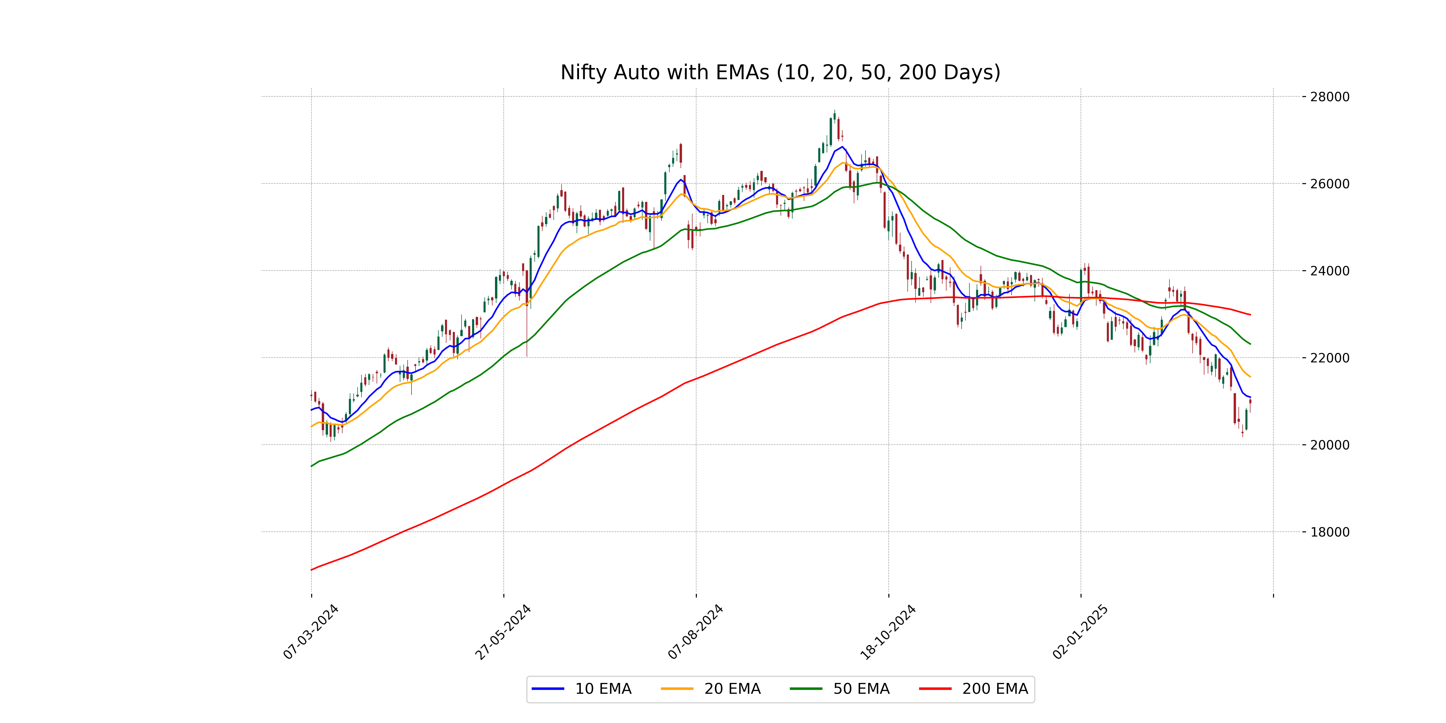 ### Nifty Auto Performance The Nifty Auto index opened at 21,030.70 and closed at 20,959.70, showing a positive change of 0.78% with a point increase of approximately 162.95. Despite the recent gain, the RSI at 37.95 suggests the index is nearing an oversold condition. The negative MACD value indicates a continuing downtrend, though the index is trading below both its 50 and 200 EMA, reflecting a bearish trend.