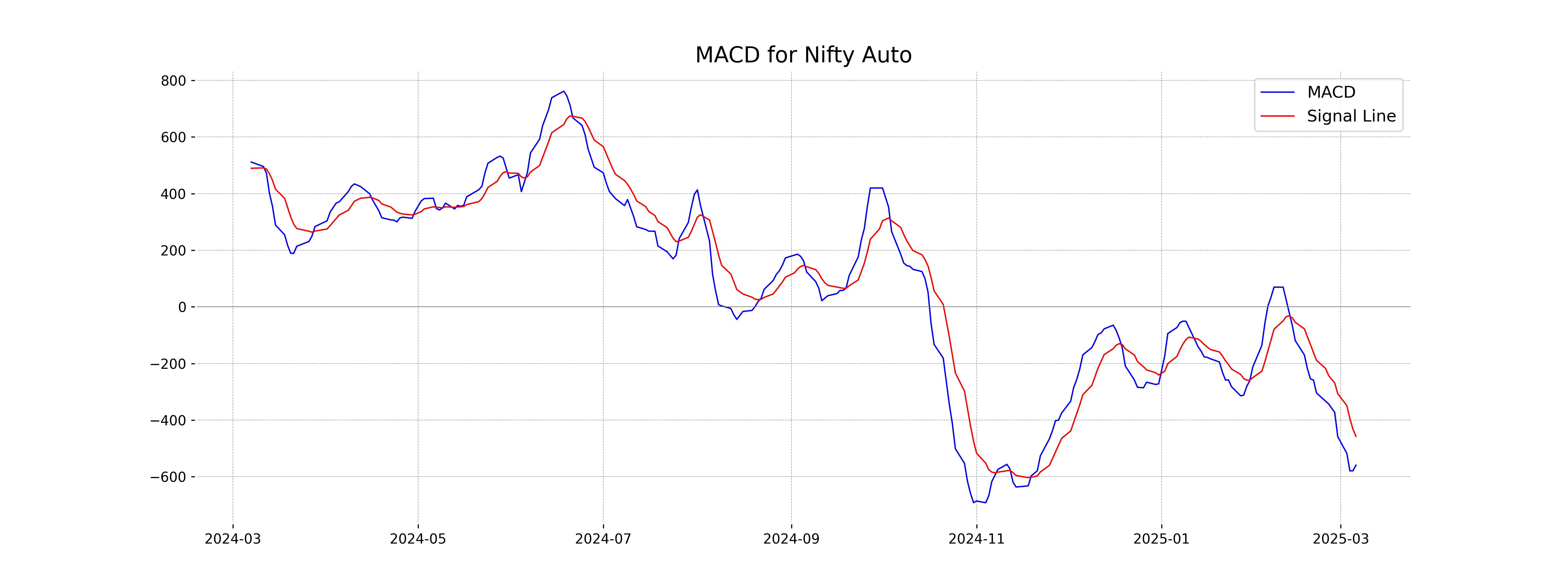 Nifty Auto's MACD value is -559.46, which is below its MACD Signal of -457.52. This negative MACD indicates a bearish trend as the MACD line is below the signal line, suggesting potential downward momentum in the stock market.