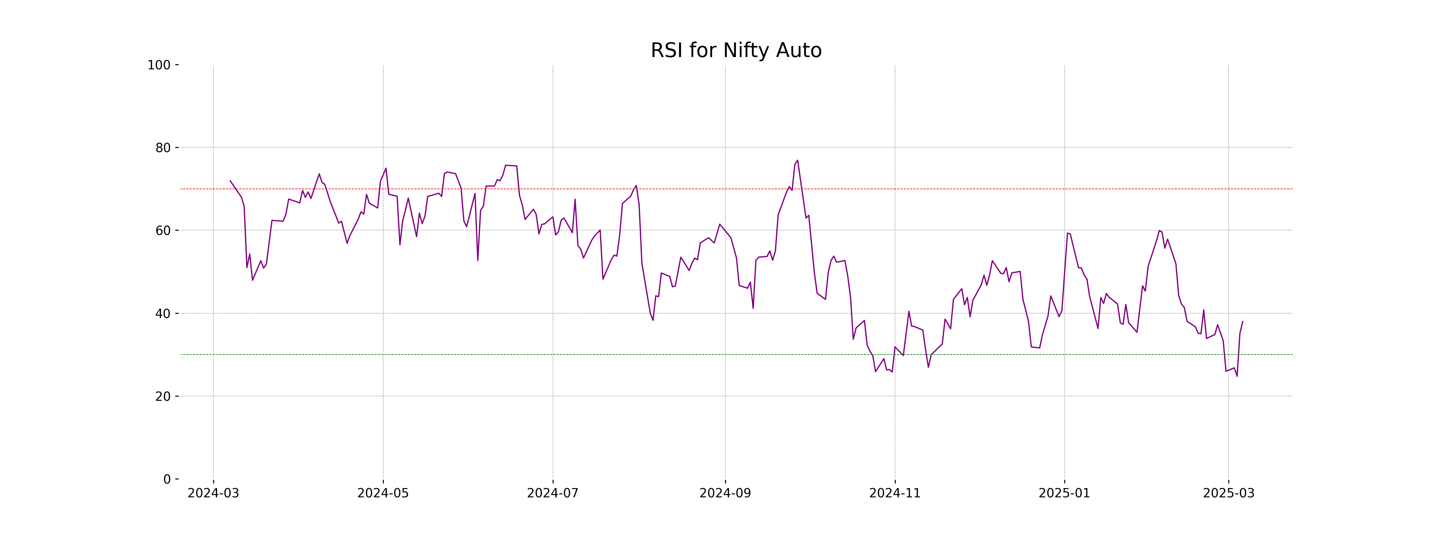 The RSI (Relative Strength Index) for Nifty Auto is 37.95, which indicates that the stock may be approaching oversold territory, as RSI values below 30 generally suggest this. However, since it is above 30, it may not yet confirm an oversold condition, but it is getting close. This could signal a potential opportunity for a bullish reversal if buyers step in.