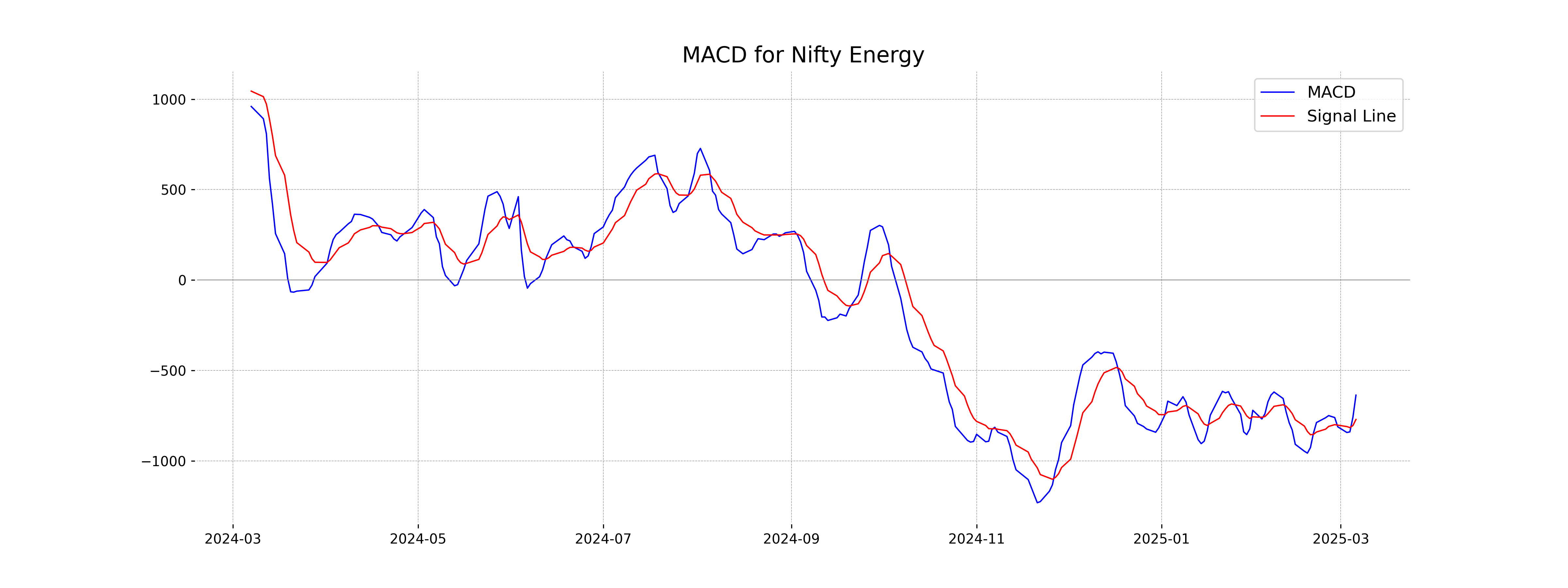 The MACD value for Nifty Energy is -636.75, while the MACD Signal is -771.29, indicating a positive divergence between the MACD line and its signal line. This suggests potential bullish momentum, as the MACD line is moving upwards relative to the signal line.