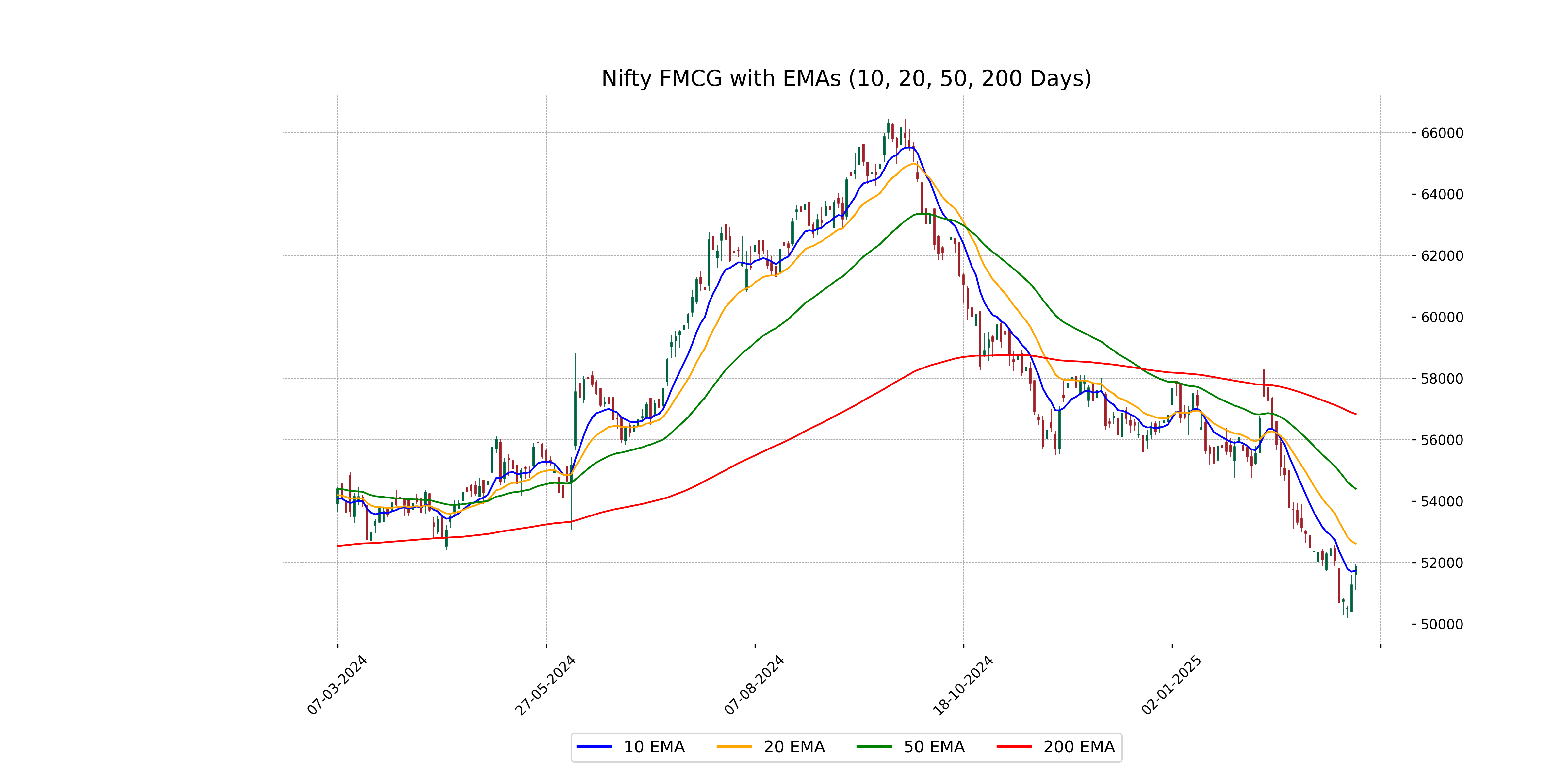 Based on the data provided, Nifty FMCG closed at 51890.30, which is above its 10 EMA of 51739.08, indicating a short-term bullish trend. However, it's still below the 20 EMA of 52617.42, 50 EMA of 54403.72, and considerably under the 200 EMA of 56836.65, suggesting a longer-term bearish pressure might persist.