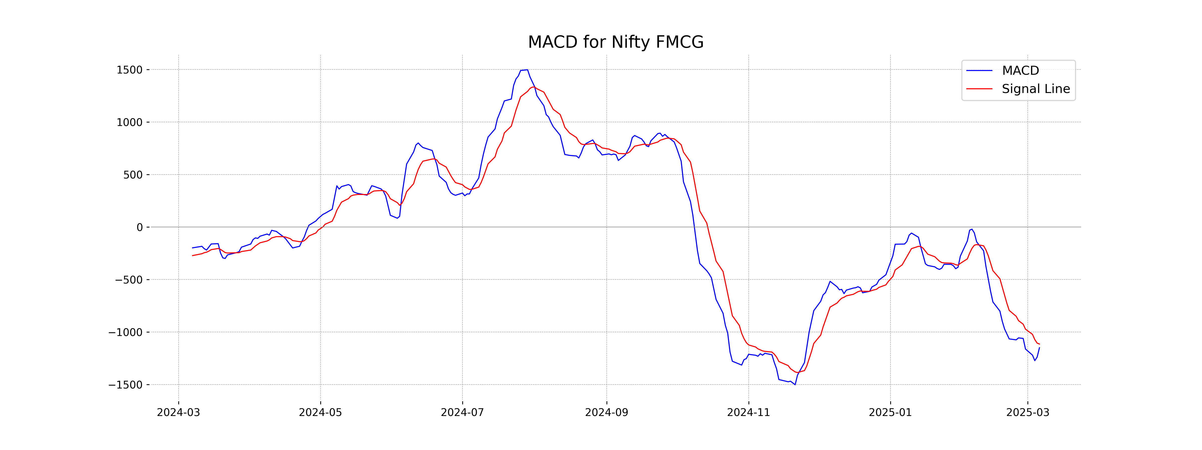 The MACD analysis for Nifty FMCG shows a value of -1149.01, which is below the MACD Signal of -1113.71. This negative divergence suggests a bearish sentiment, indicating potential downward momentum in the market. The RSI value of 38.70 also supports this outlook, reflecting stronger selling pressure.
