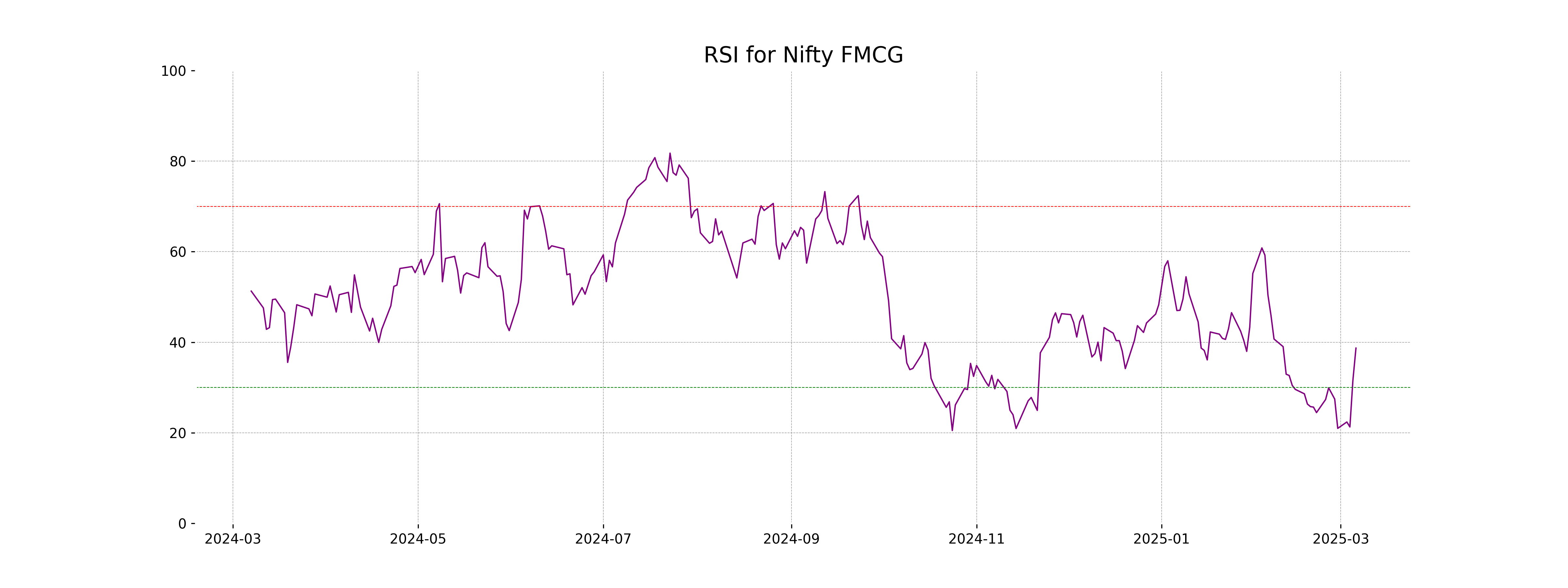 Nifty FMCG's RSI is currently at 38.70, which indicates that the stock might be approaching oversold conditions as values below 30 are generally considered oversold. This suggests bearish momentum, but investors may watch for a potential reversal if the RSI turns upward near this level.