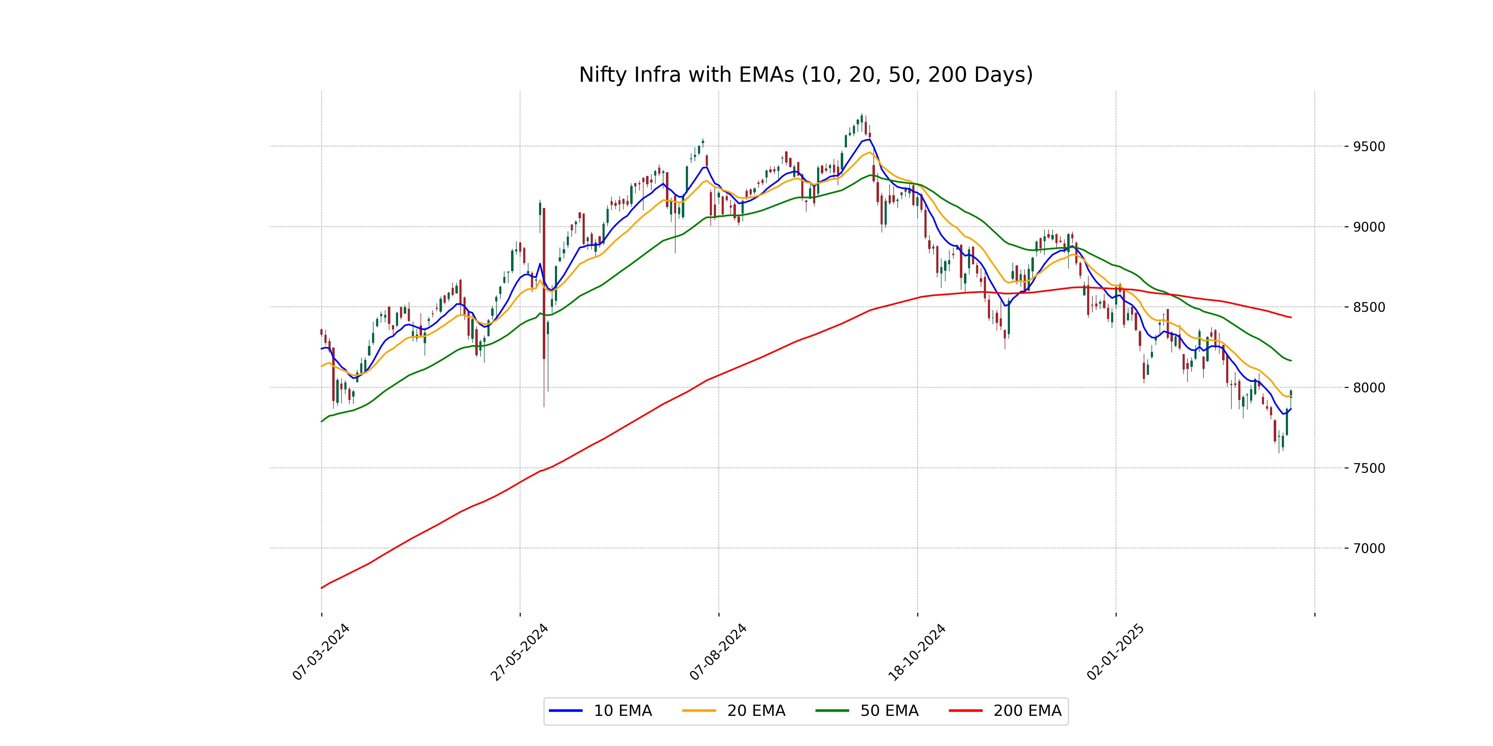 Nifty Infra closed at 7979.55, which is slightly above the 10-EMA of 7865.45 but below both the 20-EMA of 7946.43 and the 50-EMA of 8166.00. This shows a short-term bullish momentum as it stays above the 10-EMA, though it remains under pressure compared to the higher averages.