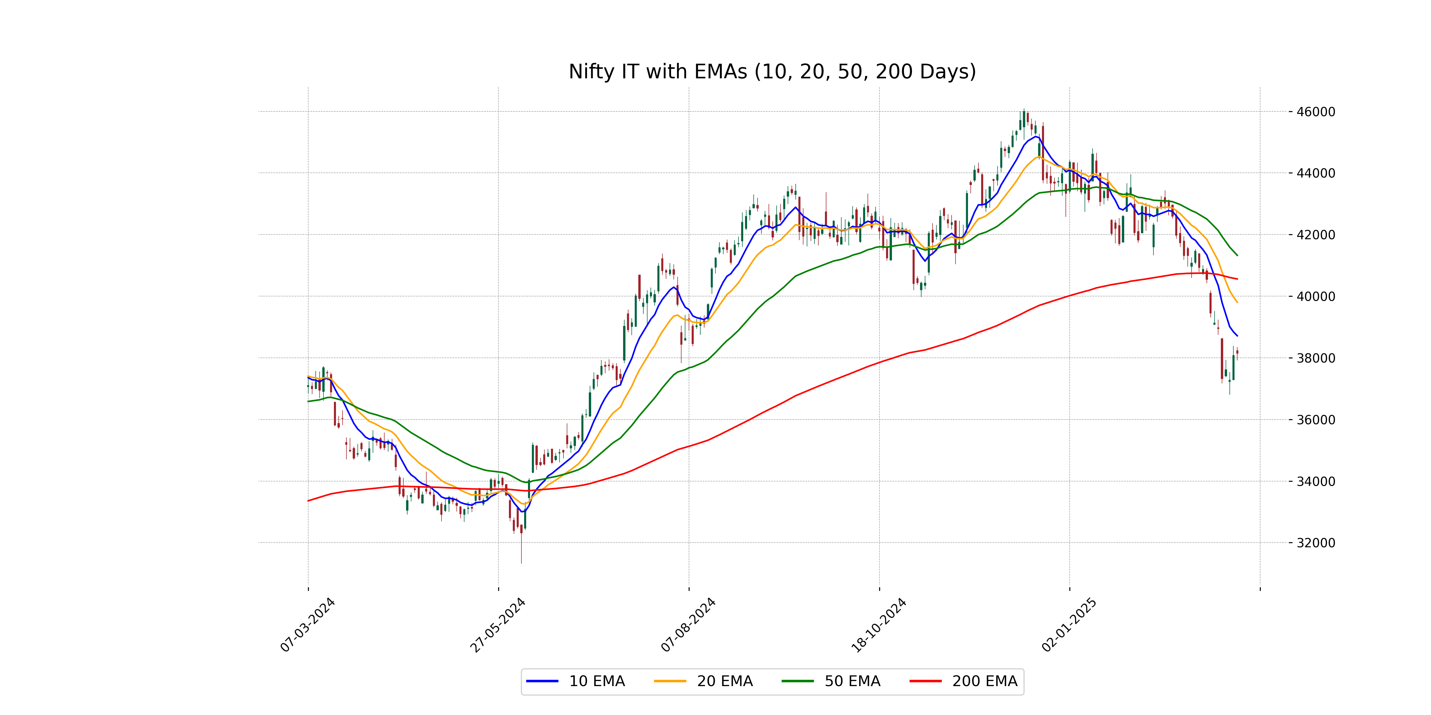 The closing price of Nifty IT at 38,145.30 is below its 50 EMA at 41,324.11 and the 200 EMA at 40,556.85, indicating a potential downward trend. Additionally, it is also below the 10 EMA and 20 EMA, suggesting short-term bearish momentum.