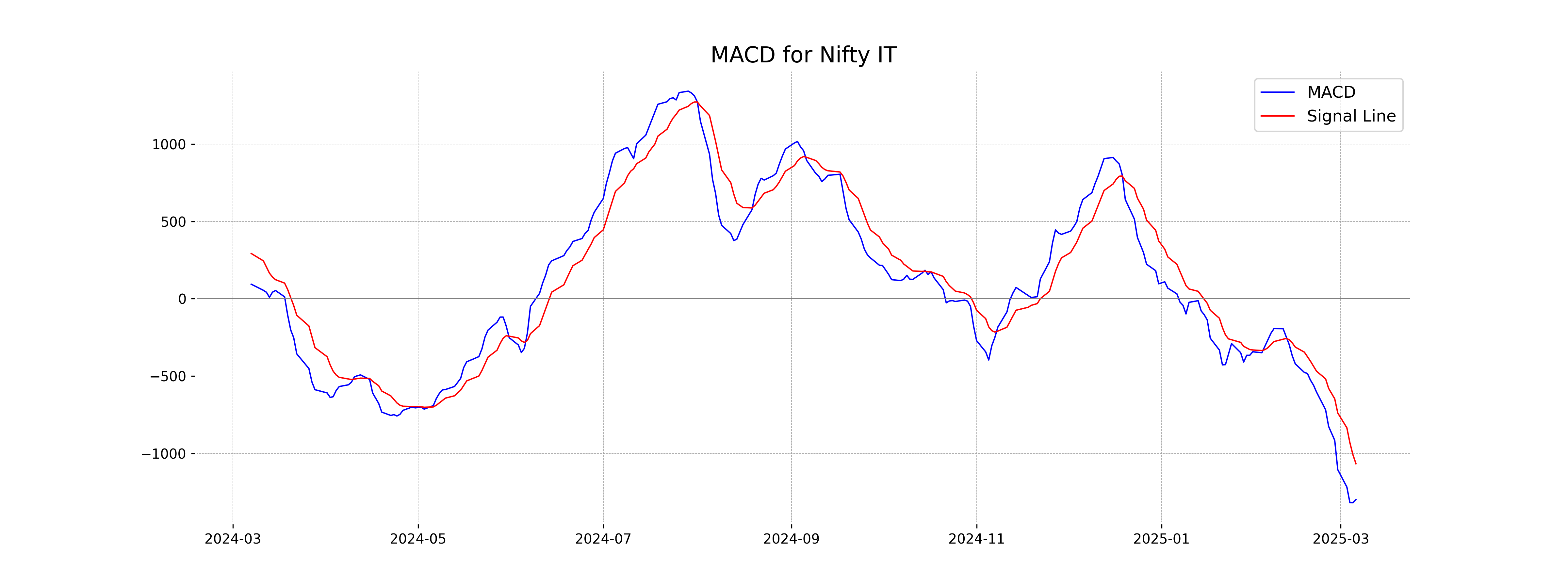The MACD value for Nifty IT is -1299.63, and the MACD signal is -1067.50, indicating a bearish trend. The MACD line is below the signal line, suggesting that the momentum is in favor of sellers. Additionally, the RSI is at 31.76, which may imply that the index is approaching the oversold territory.