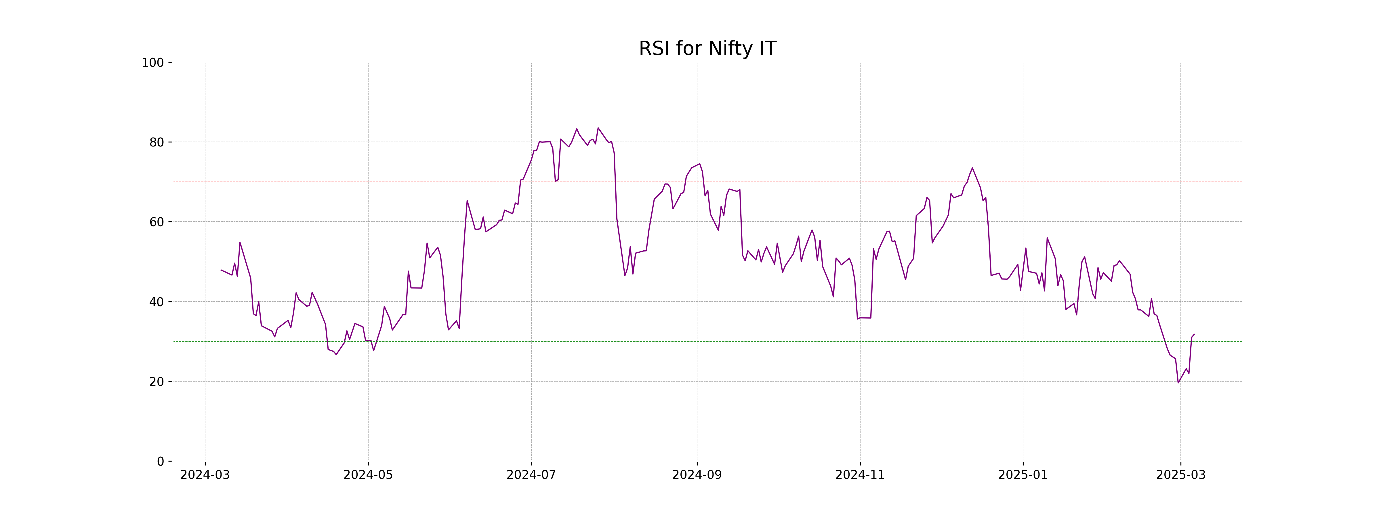 The RSI value for Nifty IT is 31.76, which is below the standard oversold threshold of 30. This suggests that the index is approaching oversold conditions, indicating potential for a price reversal or consolidation phase if similar trends continue.