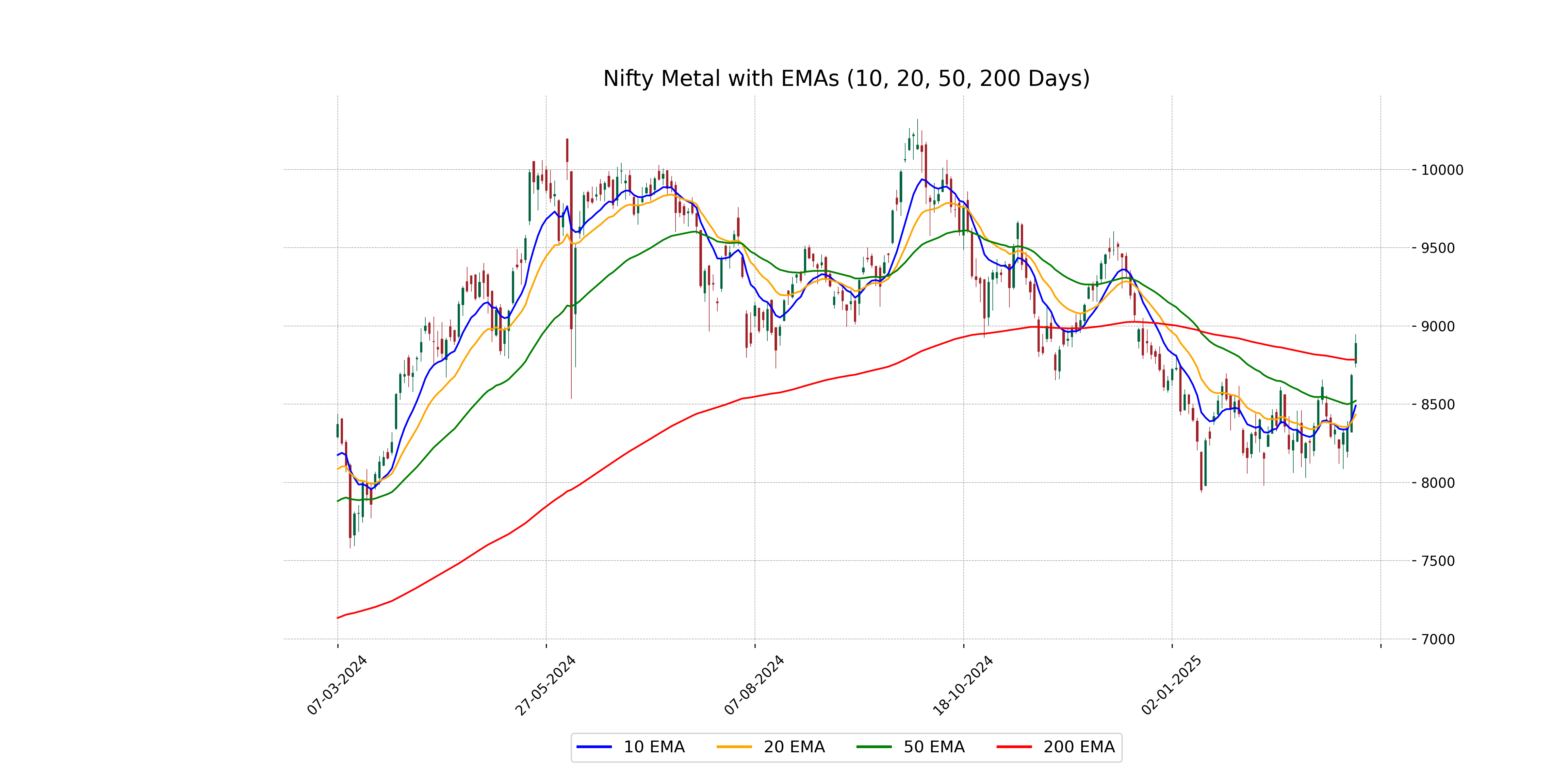 Nifty Metal closed above its 50 EMA and 20 EMA, as well as its 200 EMA, indicating a strong uptrend. The current close at 8888.65 is higher than both the 50 EMA (8521.93) and 200 EMA (8784.76), which suggests bullish momentum.