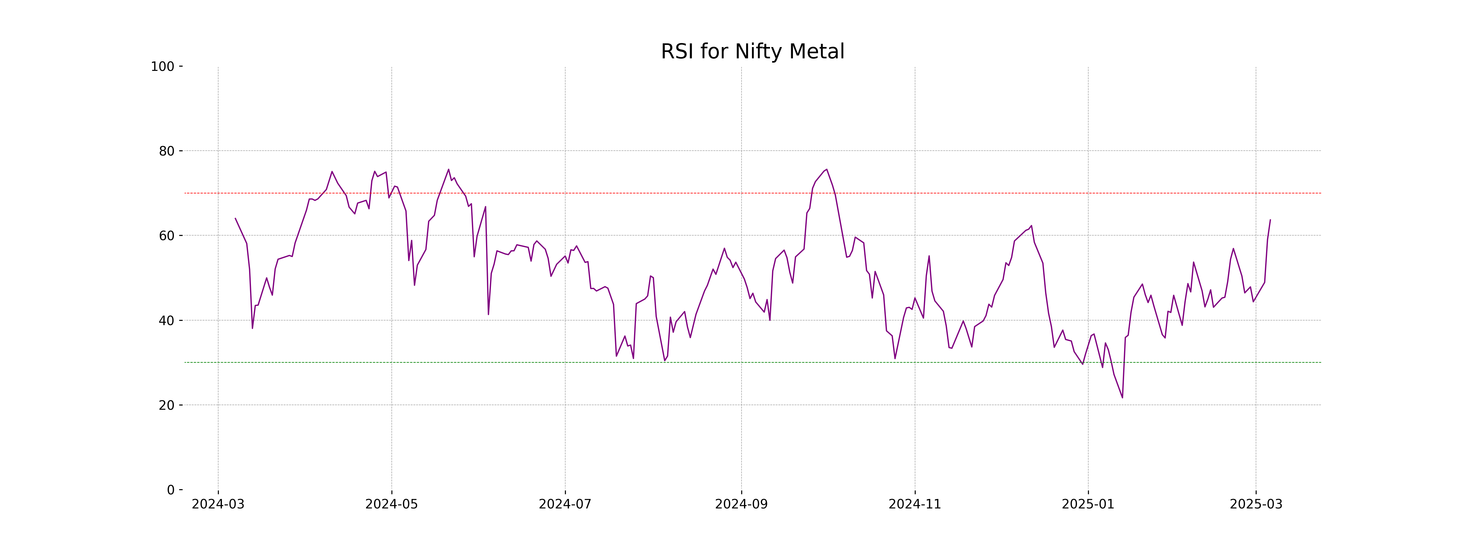 The RSI value for Nifty Metal stands at 63.65, which suggests that the index is approaching overbought territory but not yet excessively overvalued. With the RSI above 60, it indicates stronger momentum and potential continuation of the current trend, though investors should watch for signs of a reversal as it nears higher levels.