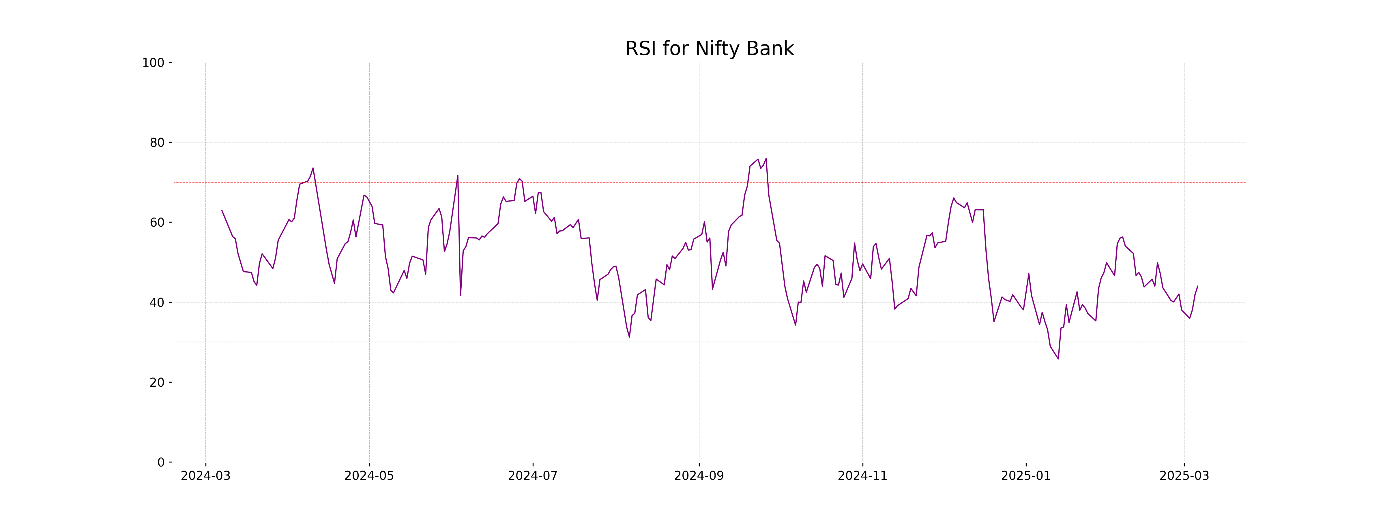 The relative strength index (RSI) for Nifty Bank is 43.97, which is below the neutral mark of 50, suggesting potential bearish momentum. An RSI below 30 typically indicates an oversold condition, so Nifty Bank is not in the oversold territory, but it is closer to suggesting a potential weakening in buying pressure.