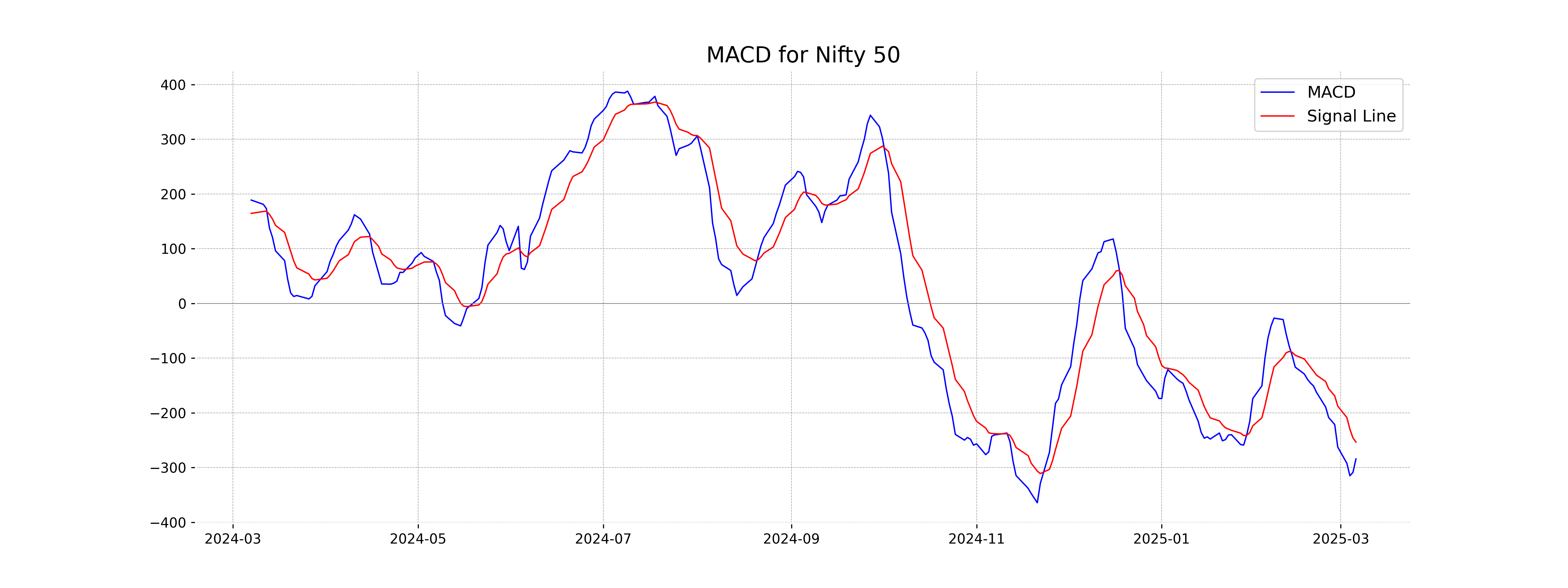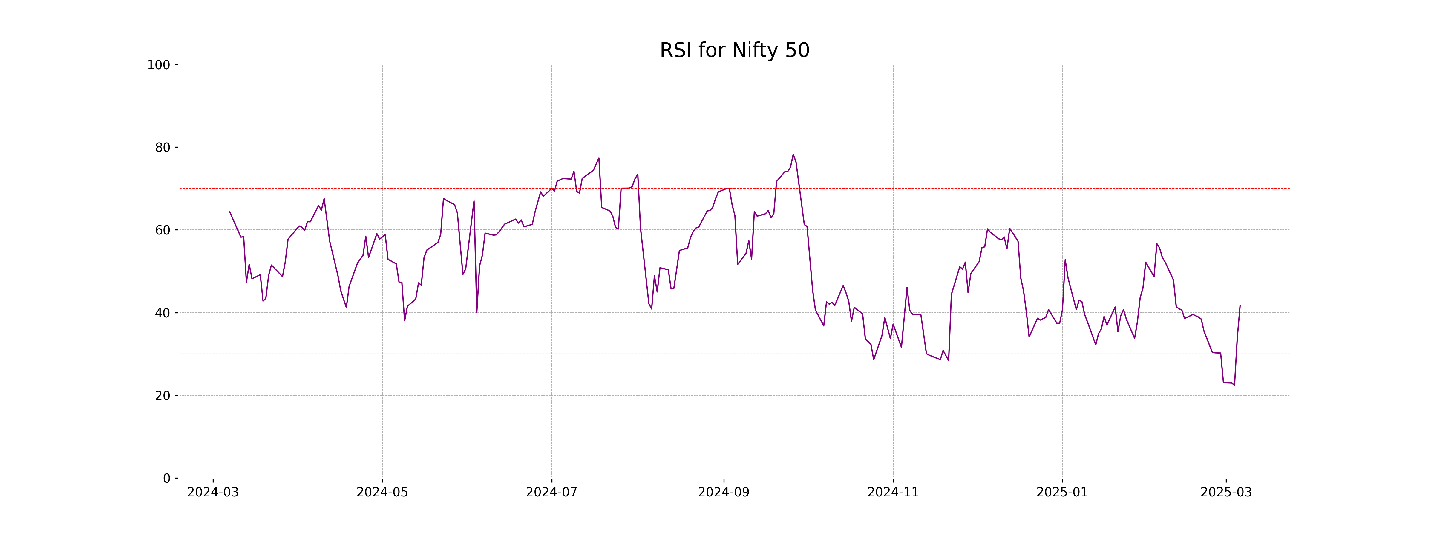 The RSI (Relative Strength Index) for Nifty 50 is currently at 41.59, indicating it is in the neutral to slightly oversold zone. Generally, an RSI below 30 suggests a stock might be oversold, while above 70 indicates overbought conditions. Nifty 50's RSI suggests it is slightly weak but not yet in the oversold territory.