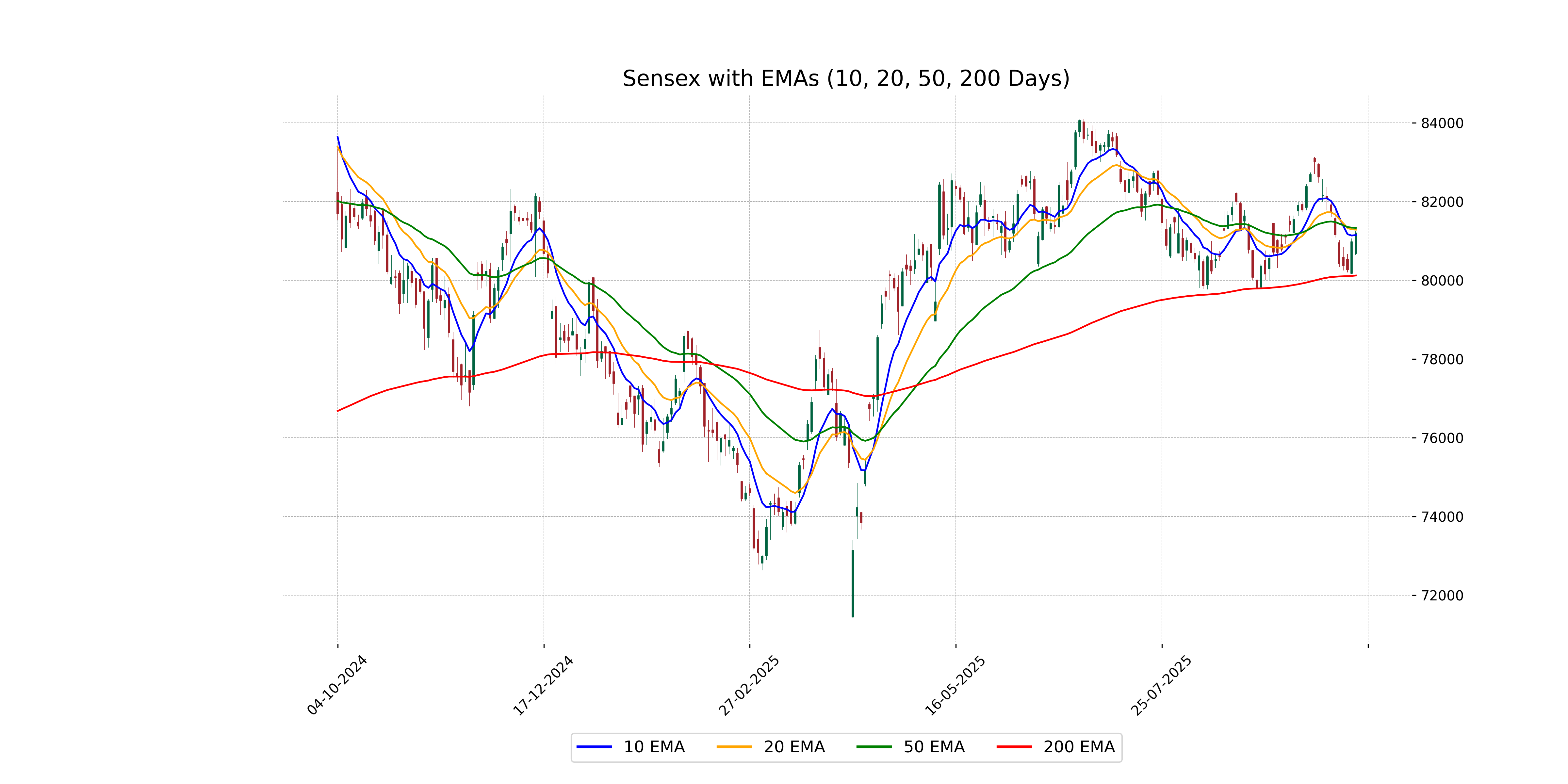 The closing value of Sensex at 81,207.17 is below its 50-day EMA of 81,335.39 and 20-day EMA of 81,289.45, but above the 200-day EMA of 80,124.30. This indicates a short-term bearish sentiment, though the longer-term trend remains above critical moving averages.