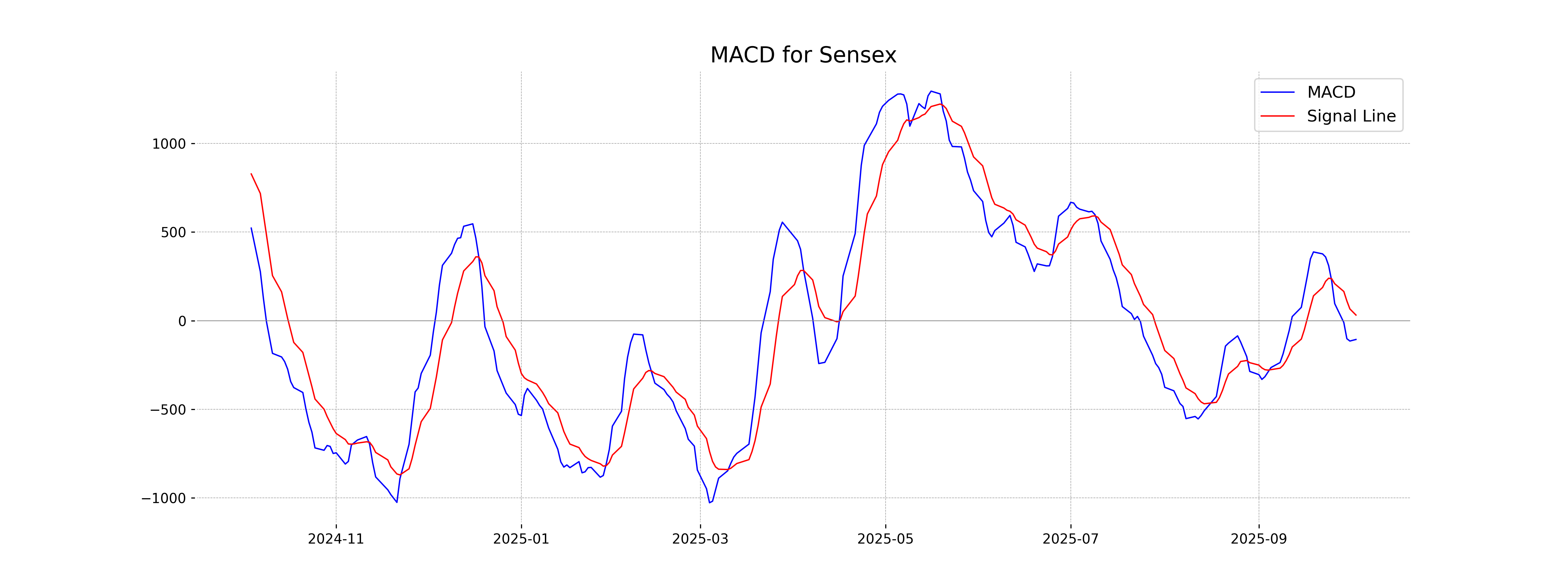 MACD Analysis for Sensex: The MACD value of -106.15 is below the MACD Signal line at 31.57, suggesting a bearish momentum or downward trend in the market. This indicates that recent price movements may continue to be negative unless a reversal occurs.