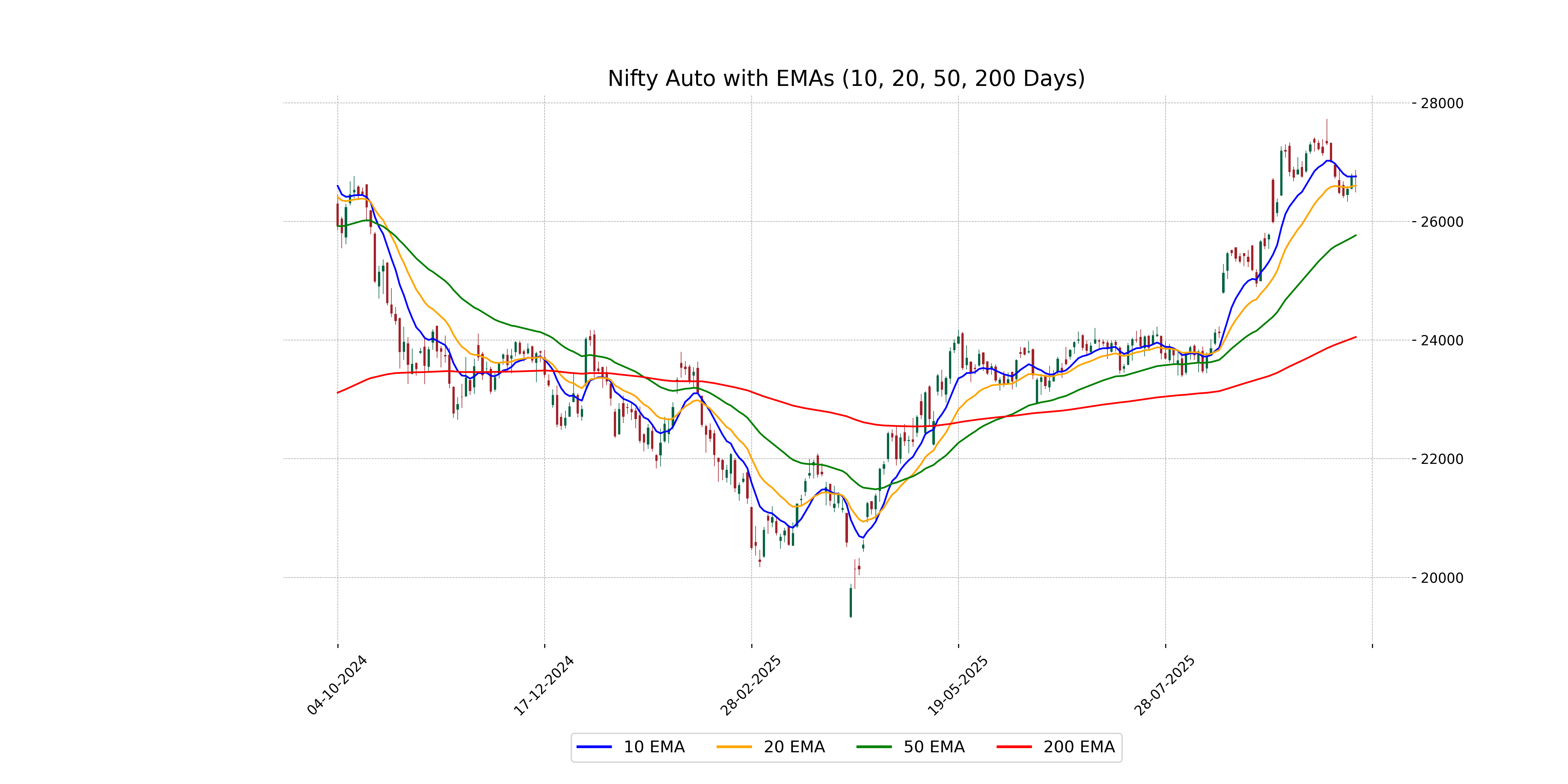Nifty Auto is currently trading slightly above both its 10-day EMA of 26757.05 and significantly above its 50-day and 200-day EMAs, which are 25766.32 and 24051.59, respectively. This suggests a moderately bullish trend, as the current price of 26753.10 indicates strength above key longer-term moving averages.