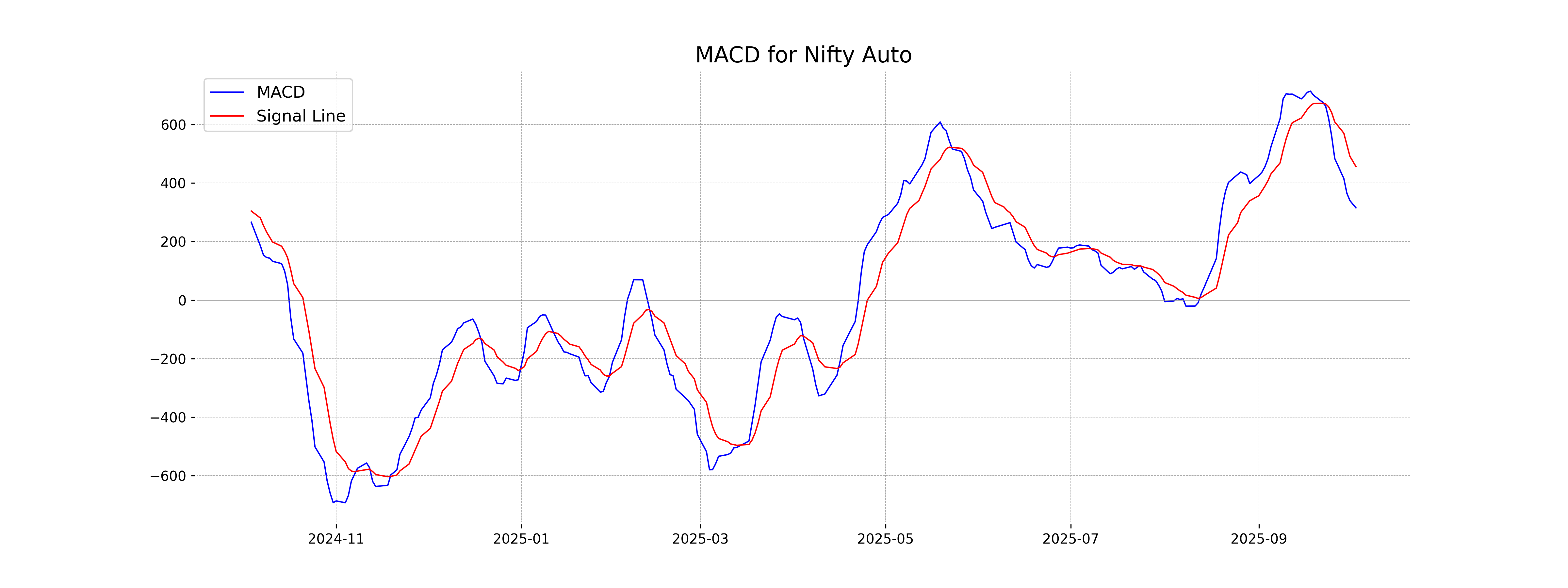 MACD Analysis for Nifty Auto: The MACD for Nifty Auto is currently at 315.02, which is below its signal line of 456.15, suggesting a bearish trend. This indicates potential selling pressure or that the current upward momentum might be weakening.