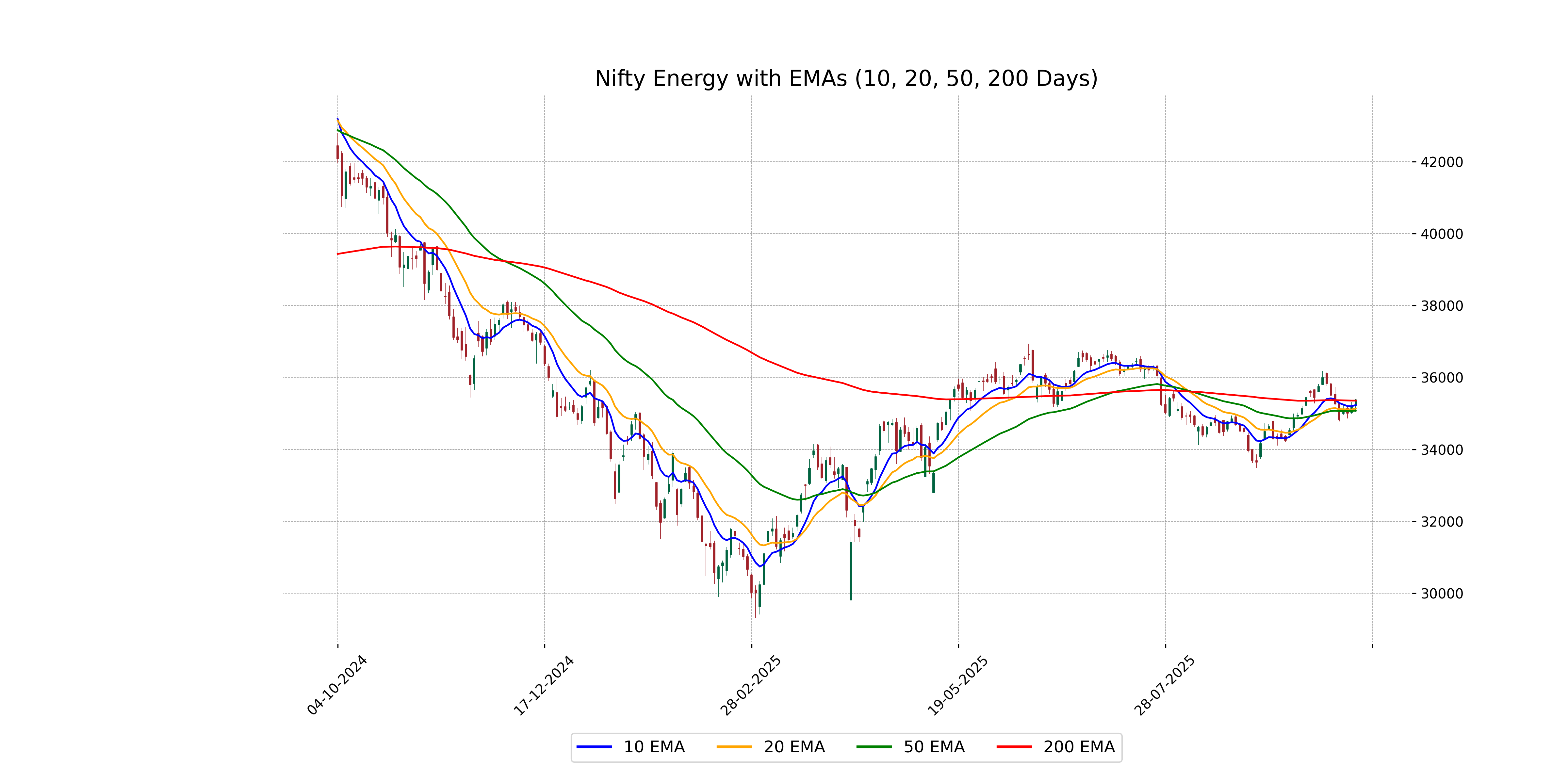 The closing price of Nifty Energy at 35,375.90 is above the 50-day EMA of 35,077.01, indicating a potential bullish trend. However, it is slightly below the 200-day EMA of 35,354.48, suggesting a level of caution. The 10 and 20-day EMAs are also below the current closing price, reinforcing near-term upward momentum.