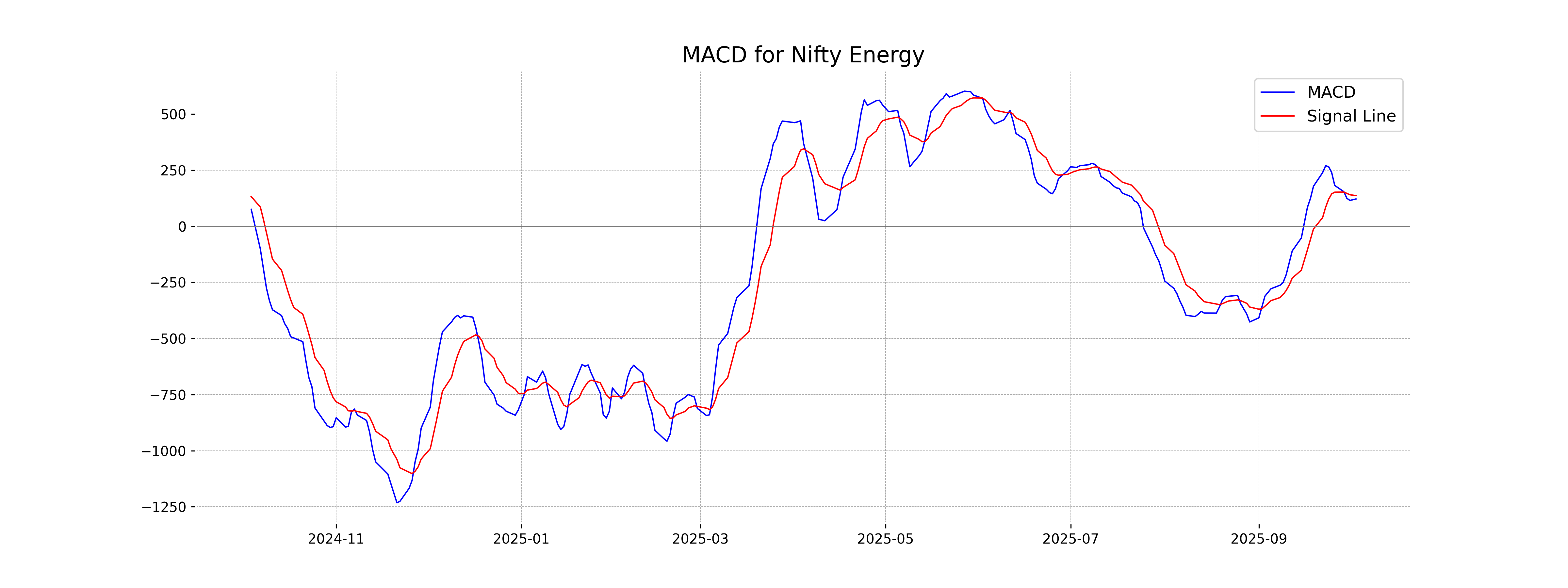Based on the data for Nifty Energy, the MACD line is at 121.65, which is below the MACD signal line of 136.73. This indicates a potential bearish signal as the MACD attempts to cross below the signal line, suggesting potential downward momentum in the stock price.