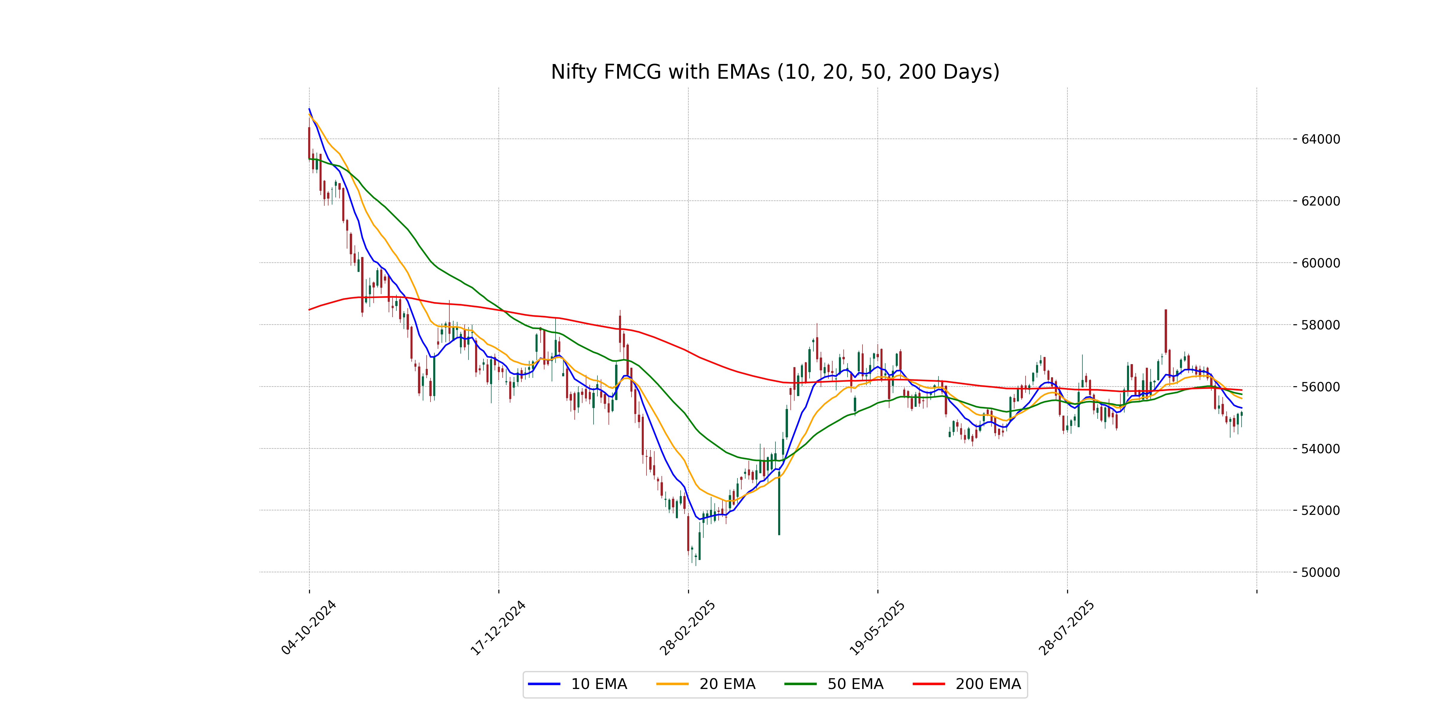 The closing price of Nifty FMCG at 55,170.60 is below its 50-day EMA of 55,749.46 and 200-day EMA of 55,885.53, indicating a bearish trend in the short and long term. It is, however, close to its 10-day EMA of 55,309.31, suggesting recent price movements have been near shorter-term averages.