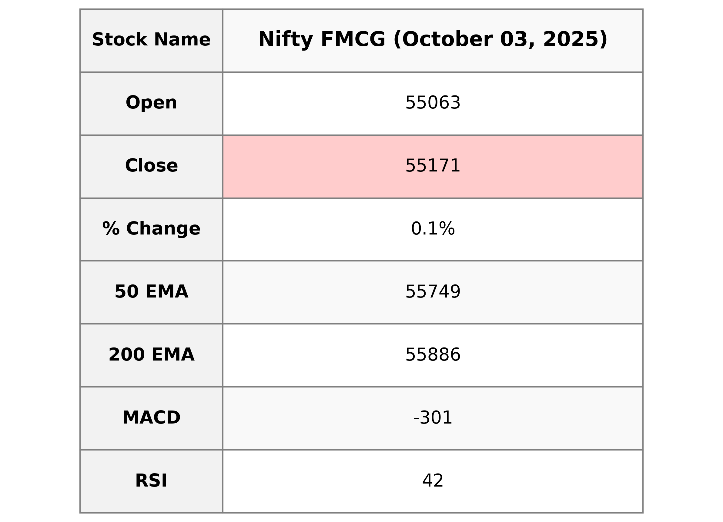 Nifty FMCG opened at 55062.95, reached a high of 55213.05, and closed at 55170.60. The index showed a slight increase with a % Change of 0.12%. The technical indicators suggest bearish momentum, with an RSI of 42.48 and a negative MACD of -300.55, indicating potential weakness in the current trend.