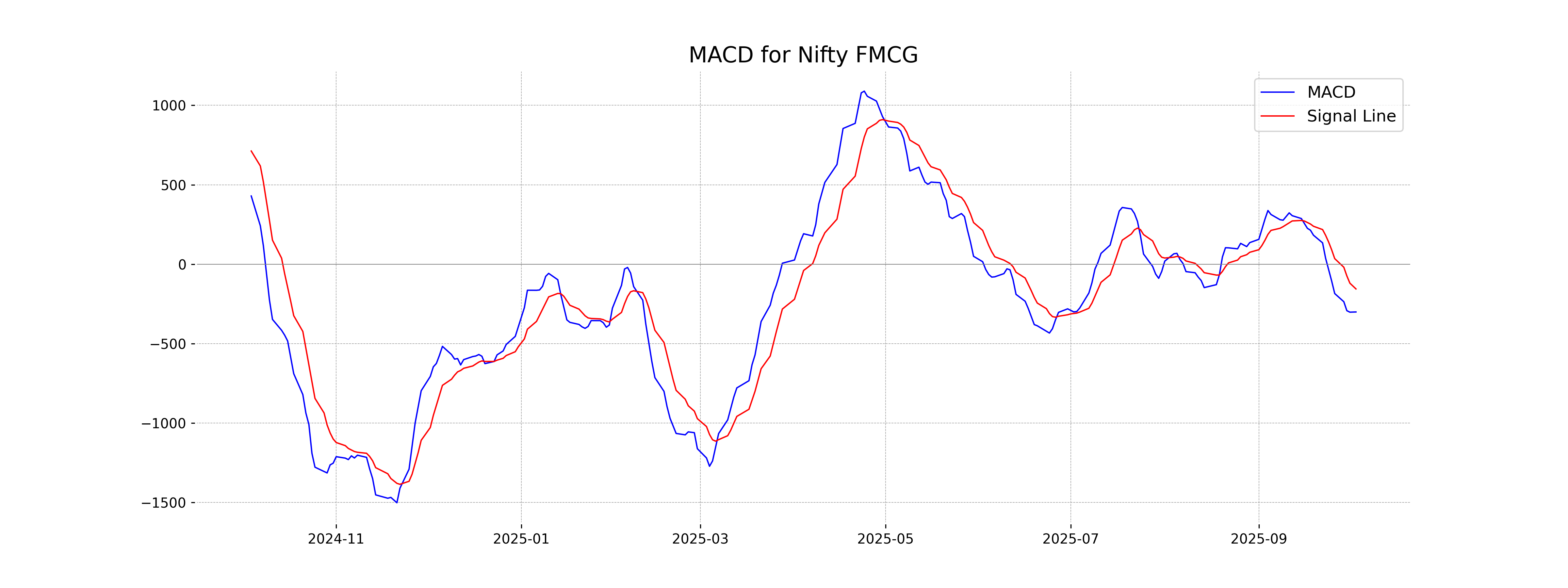 The MACD for Nifty FMCG is at -300.55 while the MACD Signal is at -155.62. This suggests a bearish momentum as the MACD is below its signal line, indicating potential weakness in the current trend.