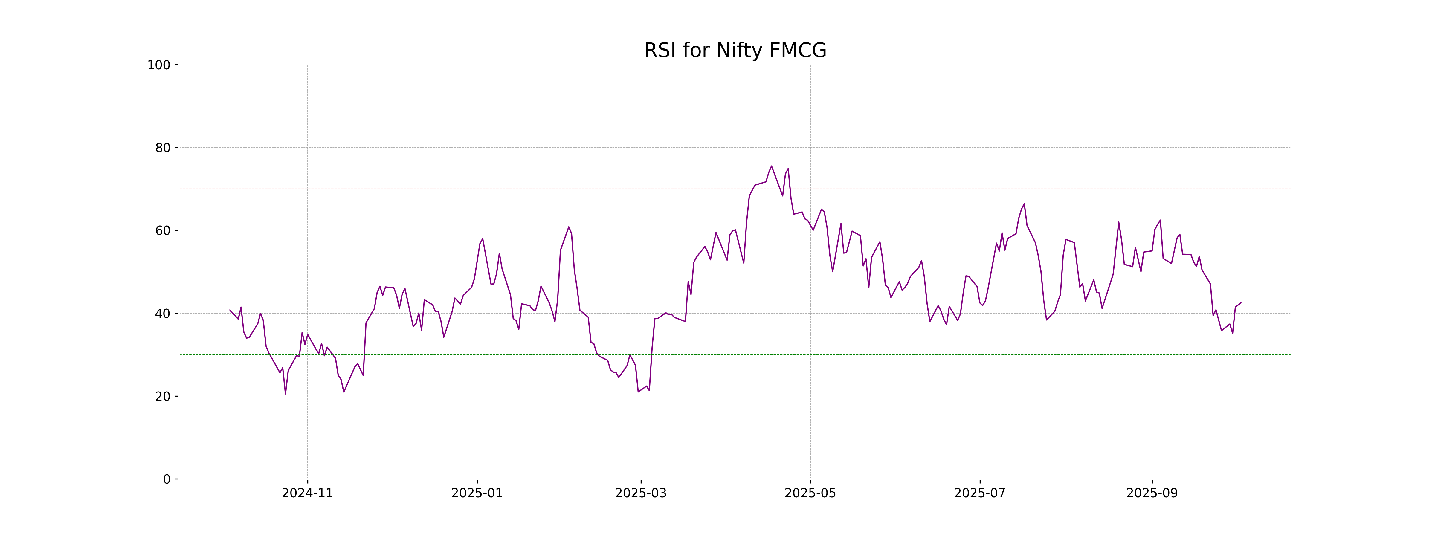 The RSI for Nifty FMCG is at 42.48, indicating that it is nearing the lower neutral zone. This suggests that the index is not yet oversold, but caution should be exercised as it approaches the 30 mark, which would imply a potential buying opportunity if it continues to decrease.