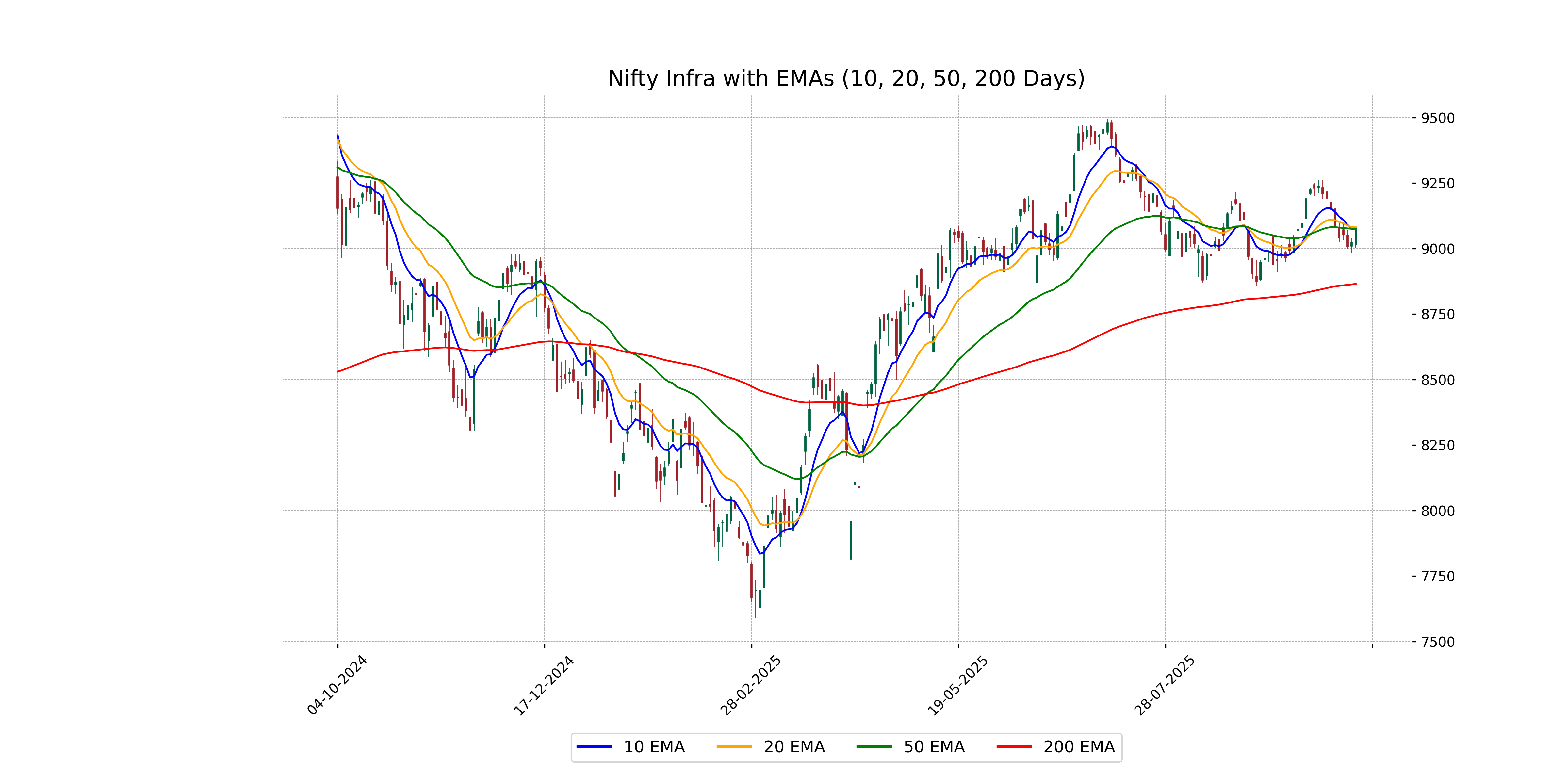 Nifty Infra closed at 9072.85, slightly below its 10-day EMA of 9077.40 and 20-day EMA of 9081.22, indicating a near-term weakness. However, it is positioned just below the 50-day EMA of 9074.05, suggesting a potential support zone. The 200-day EMA at 8864.97 remains significantly lower, reflecting a sustained long-term uptrend.