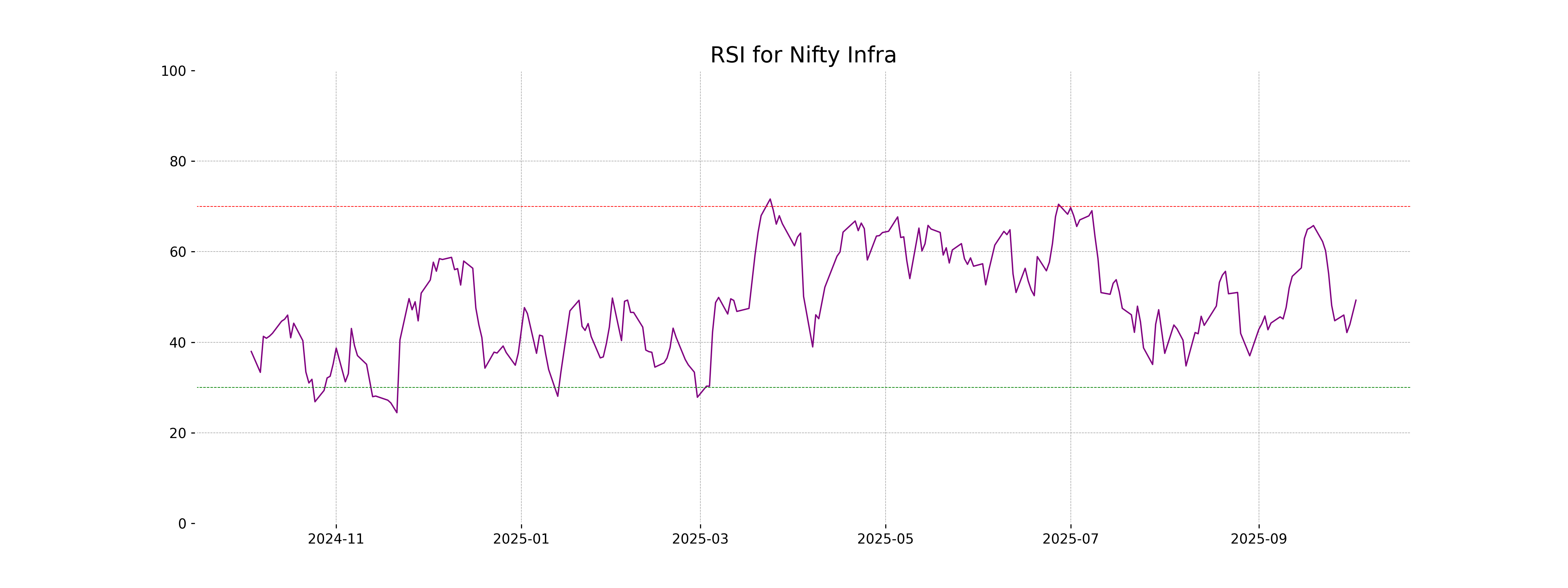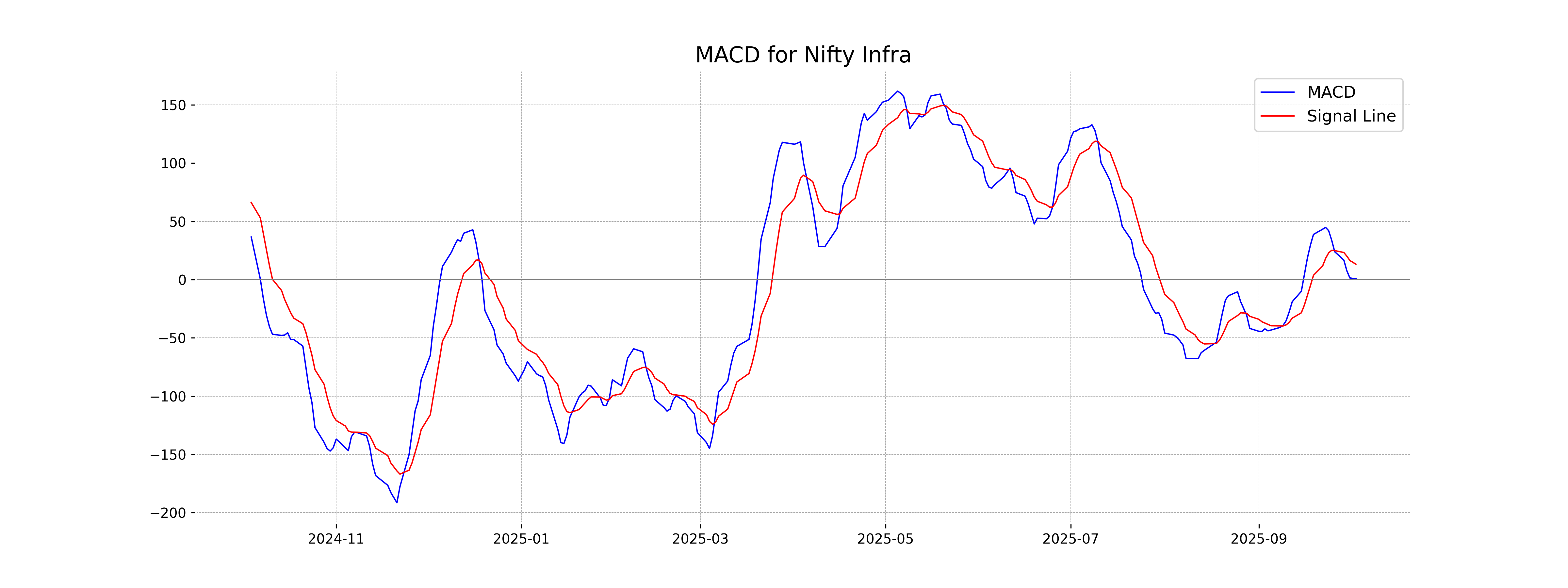 The Relative Strength Index (RSI) for Nifty Infra is currently at 49.29, which is close to the midpoint of the 0-100 scale. This indicates a neutral trend, suggesting neither overbought nor oversold conditions. Investors might look for additional indicators to determine future price movement direction.