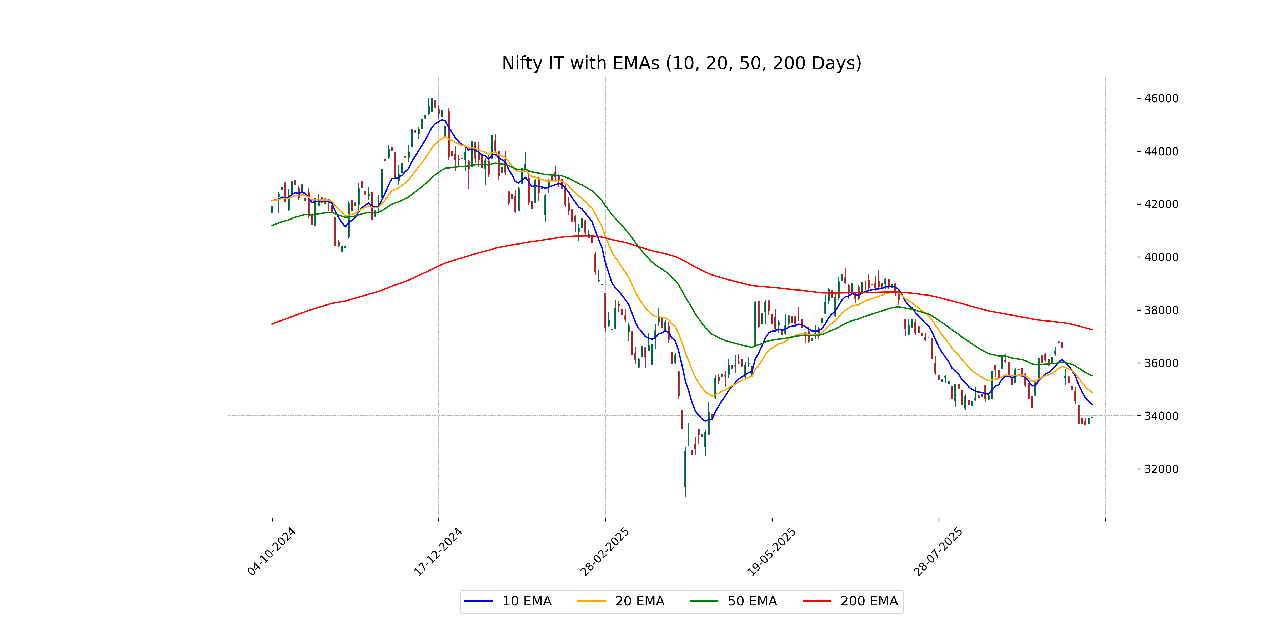 The Nifty IT index closed at 33,949.75, which is below its 10-day, 20-day, 50-day, and 200-day exponential moving averages (EMAs) of 34,431.12, 34,884.57, 35,506.40, and 37,251.82 respectively. This positioning suggests a bearish trend as the index is trading below key moving average levels.