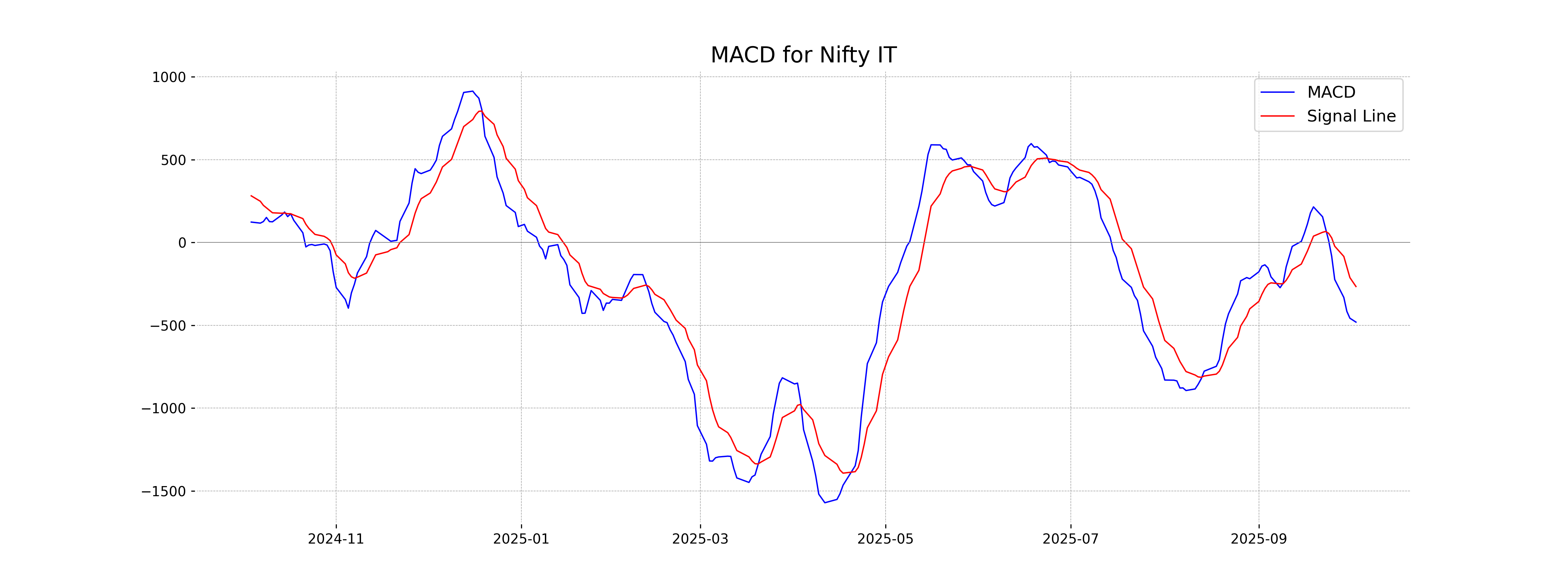 Based on the data provided, Nifty IT has a negative MACD value of -480.72, which is below its MACD Signal line of -265.67. This indicates a bearish momentum for the index, suggesting that the recent price trend might continue downwards.