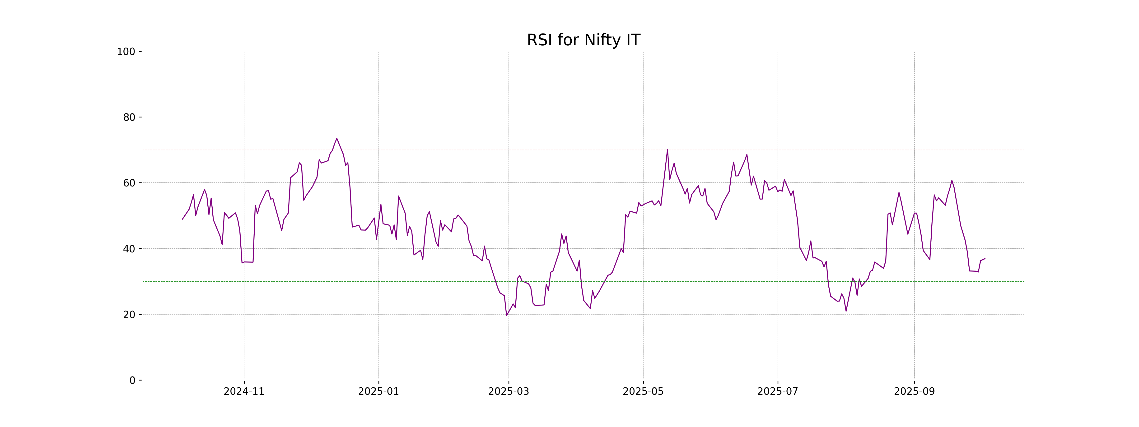 The RSI for Nifty IT is currently at 36.92, indicating that the index is approaching the oversold region. This suggests increased selling pressure, and if the trend continues, it may present a buying opportunity as the index nears or crosses the oversold threshold of 30.