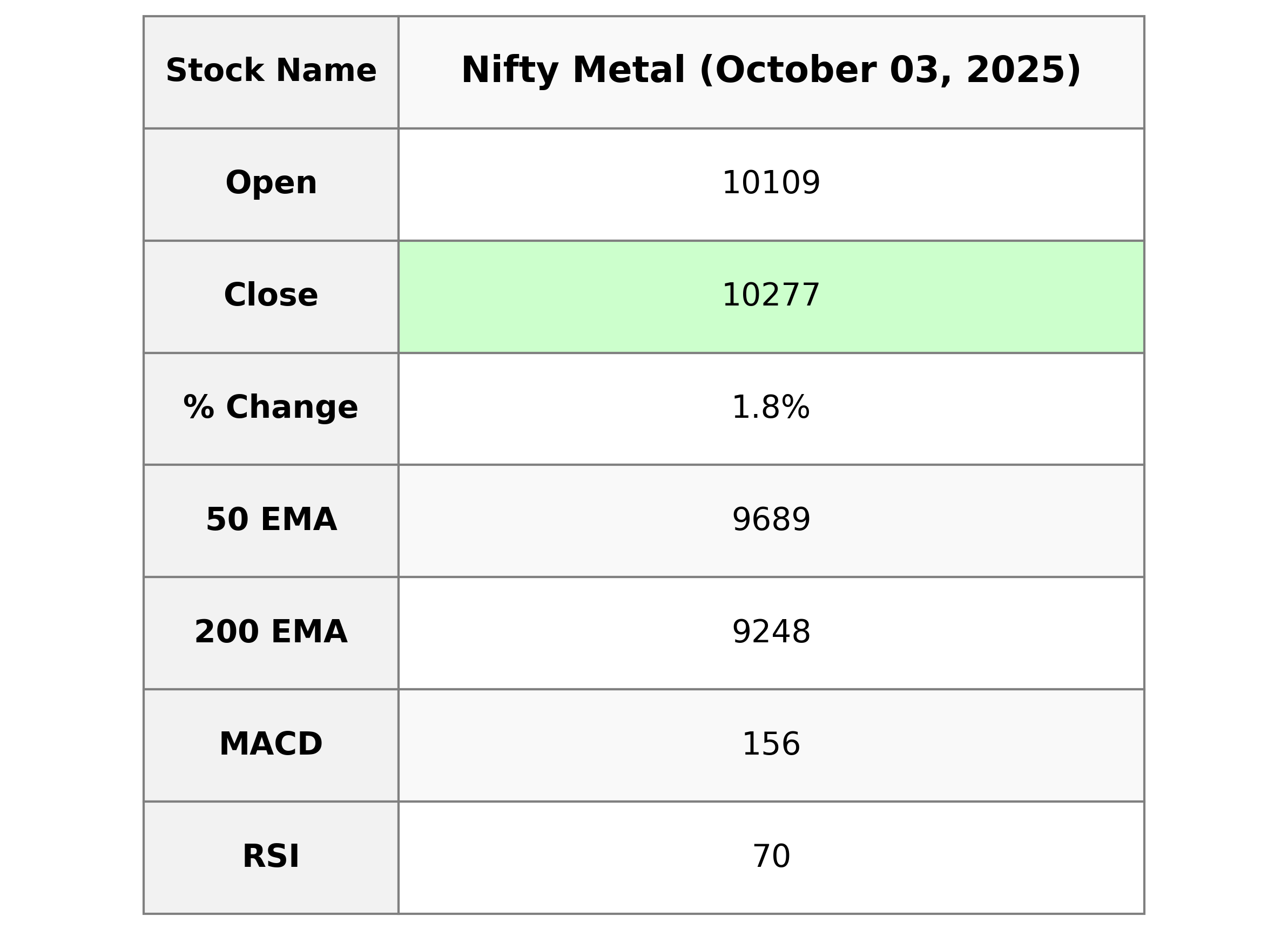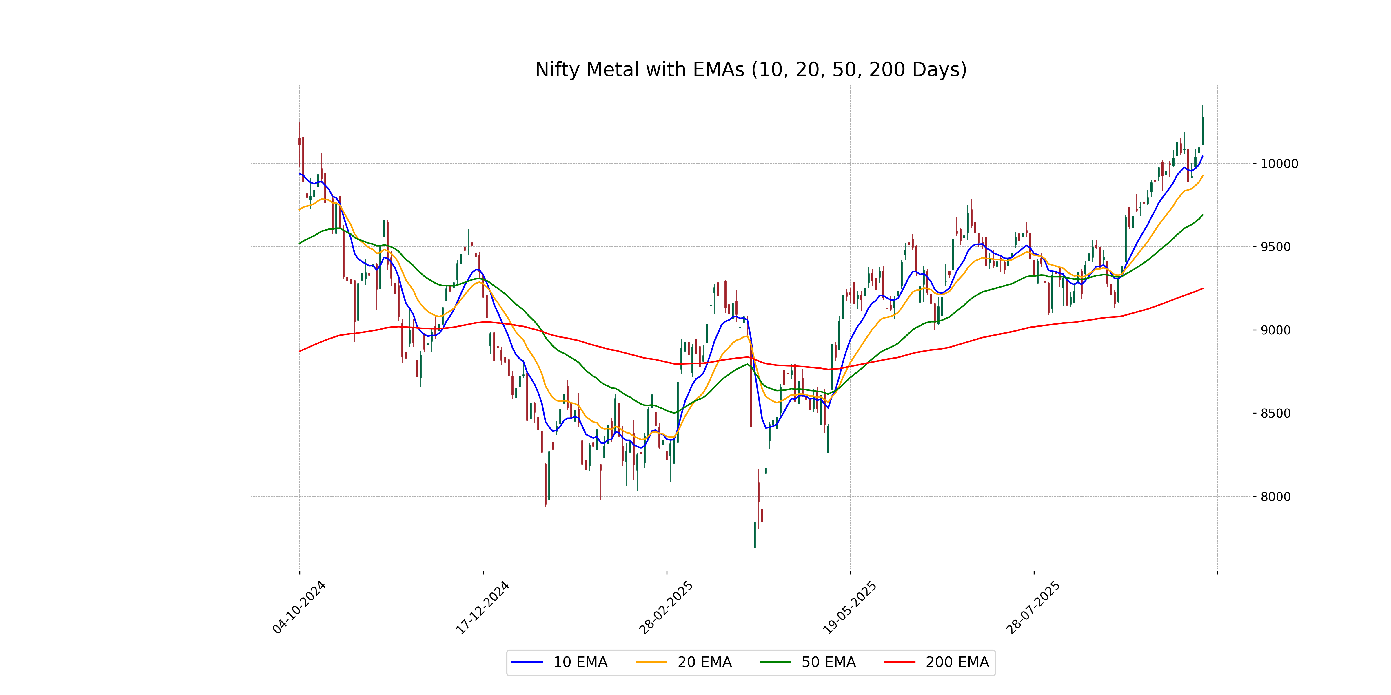 The closing price of Nifty Metal is above its 10 EMA at 10,043.36, 20 EMA at 9,924.33, 50 EMA at 9,689.37, and 200 EMA at 9,248.21, indicating a strong bullish trend. Additionally, the RSI value of 70.16 suggests it may be in overbought territory.