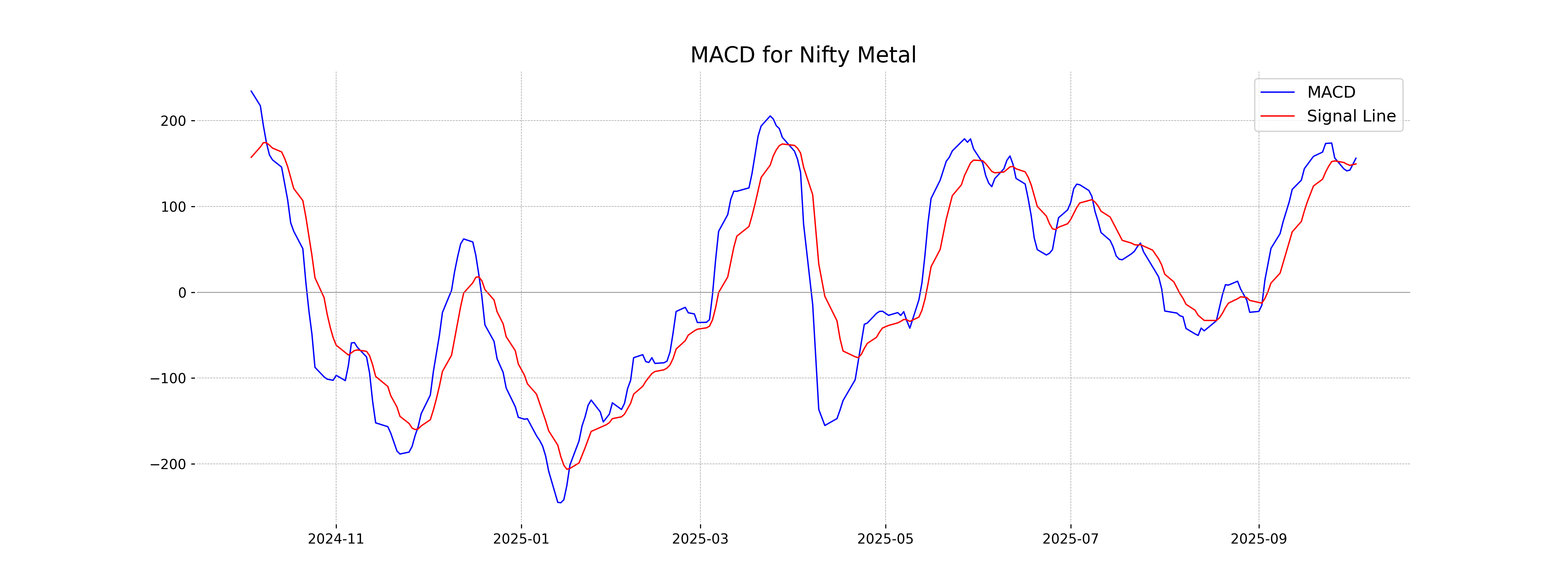 The MACD for Nifty Metal is showing positive momentum as it is above the signal line, with a MACD value of 156.22 compared to a signal line of 149.61. This suggests a bullish trend and potential continued upward movement in the stock.