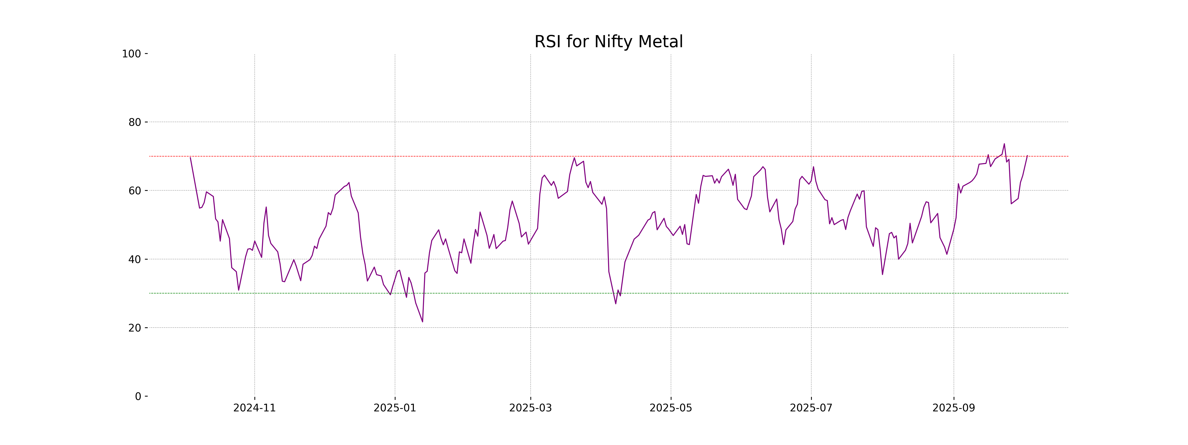 The RSI for Nifty Metal is 70.16, indicating that the index is in the overbought territory. This suggests that there might be a potential for a downward correction or consolidation in the near term. However, as with any technical indicator, it's important to consider it alongside other data and market conditions for a comprehensive analysis.