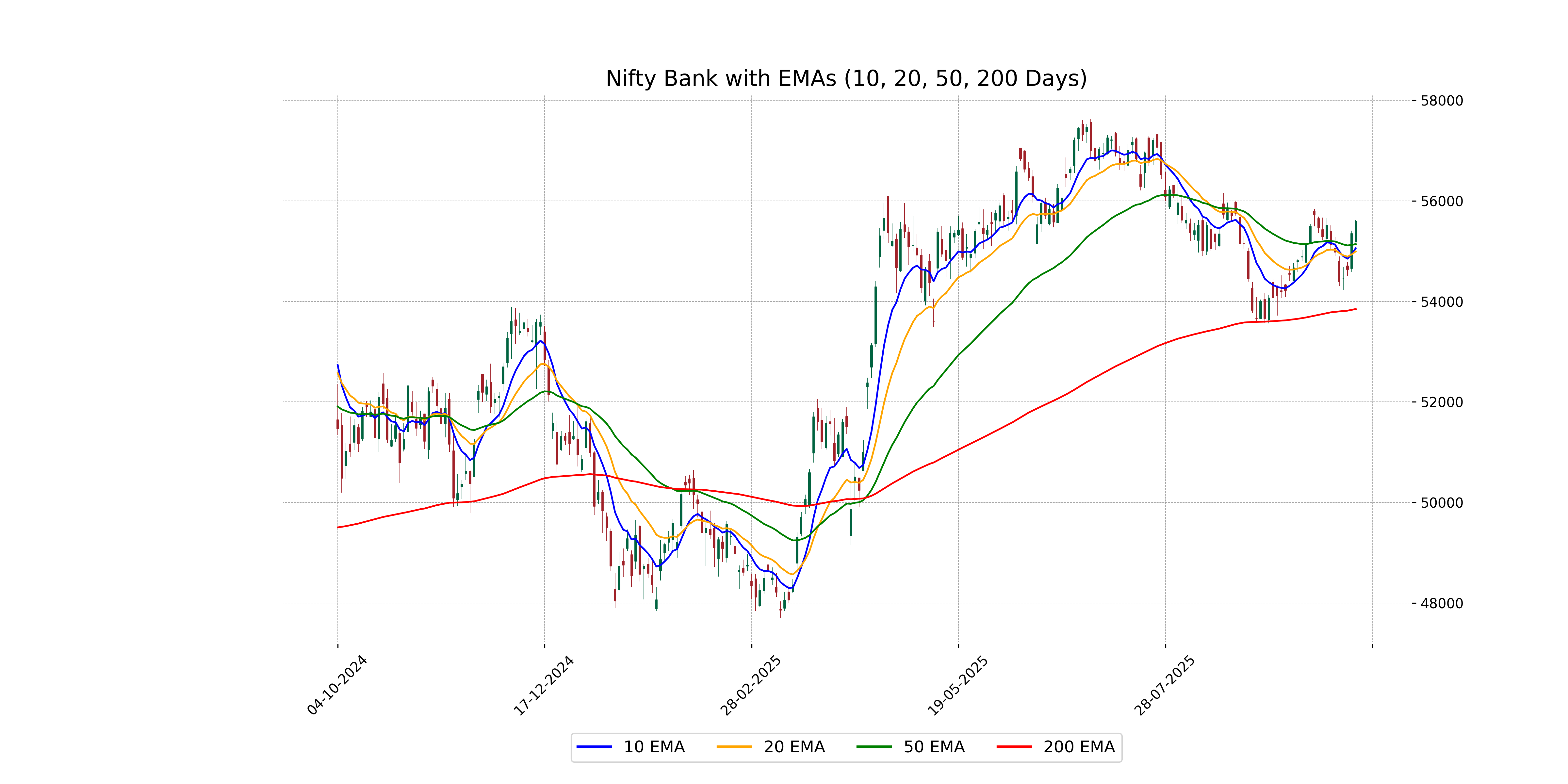 The Nifty Bank closed at 55589.25, above its 50-day EMA of 55141.09, indicating a potential upward momentum. The close is also above the 10-day EMA of 55058.73 and the 20-day EMA of 54996.14, suggesting short-term bullishness.