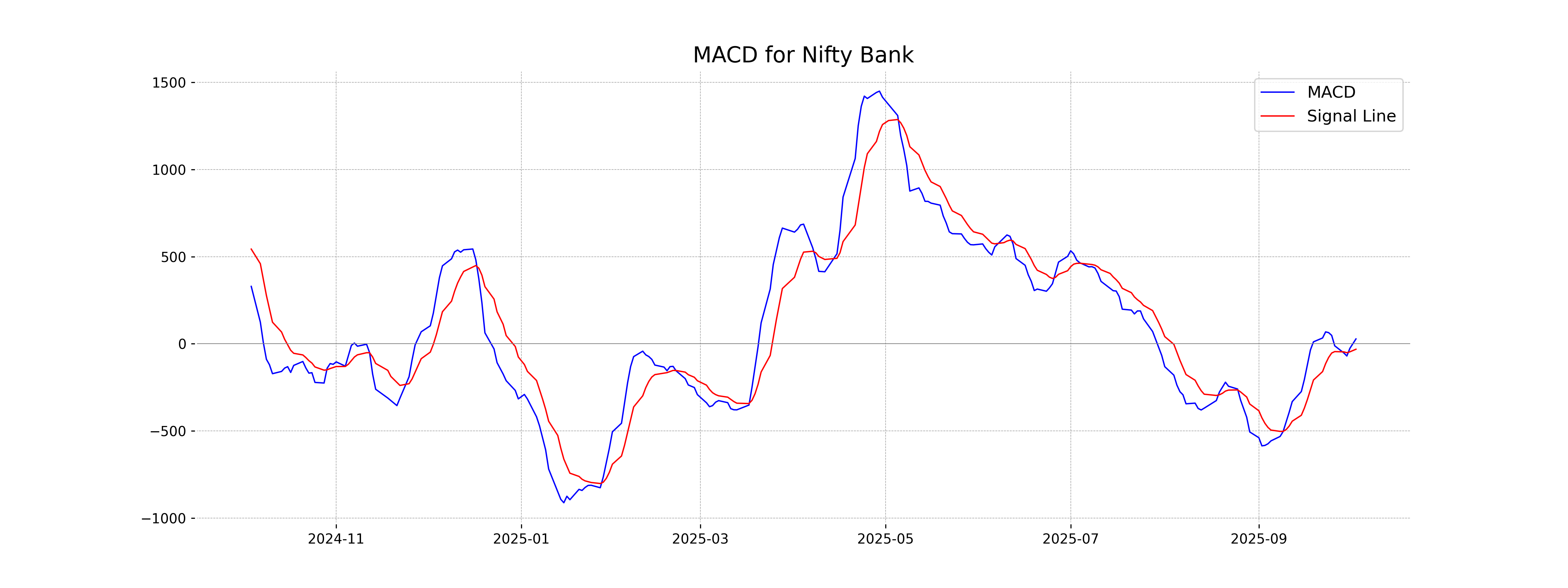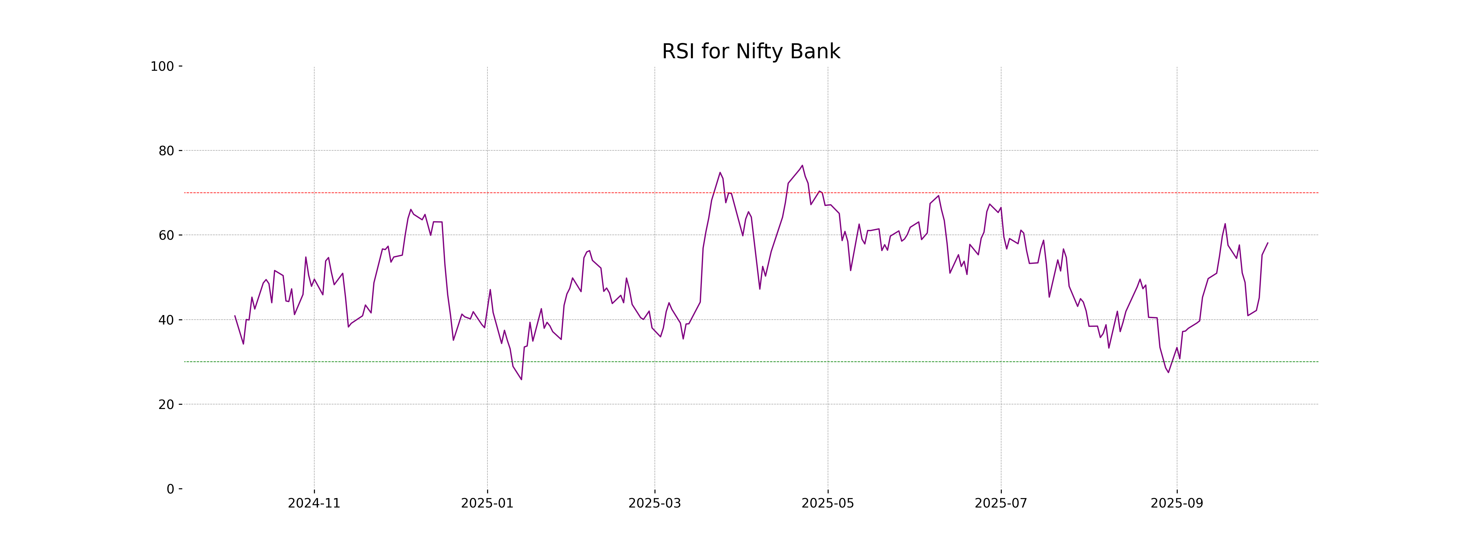 The RSI (Relative Strength Index) for Nifty Bank is at 58.10, which suggests a neutral to slightly bullish momentum. An RSI above 50 typically indicates more buying interest, though it is still below the overbought threshold of 70, suggesting potential room for further upward movement without being overbought.